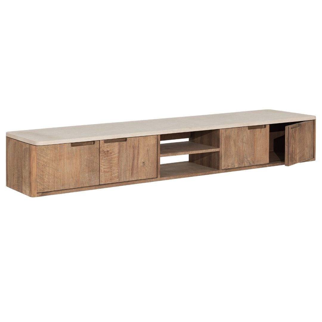 Tyylikäs seinään kiinnitettävä tv taso, joka on valmistettu ylellisestä kierrätystiikistä sekä mortex kiviaineesta, jossa on marmorimainen elävä pinta. Tämä tv-taso on mahdollista nostaa seinälle. Ripustettava televisiotaso jättää lattian vapaaksi ja on siksi ilmava ja siisti ratkaisu moneen tilaan. Laadukas viimeistelty tiikki sekä kivimäinen mortex yhdessä tekevät tästä kalusteesta upean kalusteen. Puun lämpö ja kiven näyttävyys samassa paketissa.