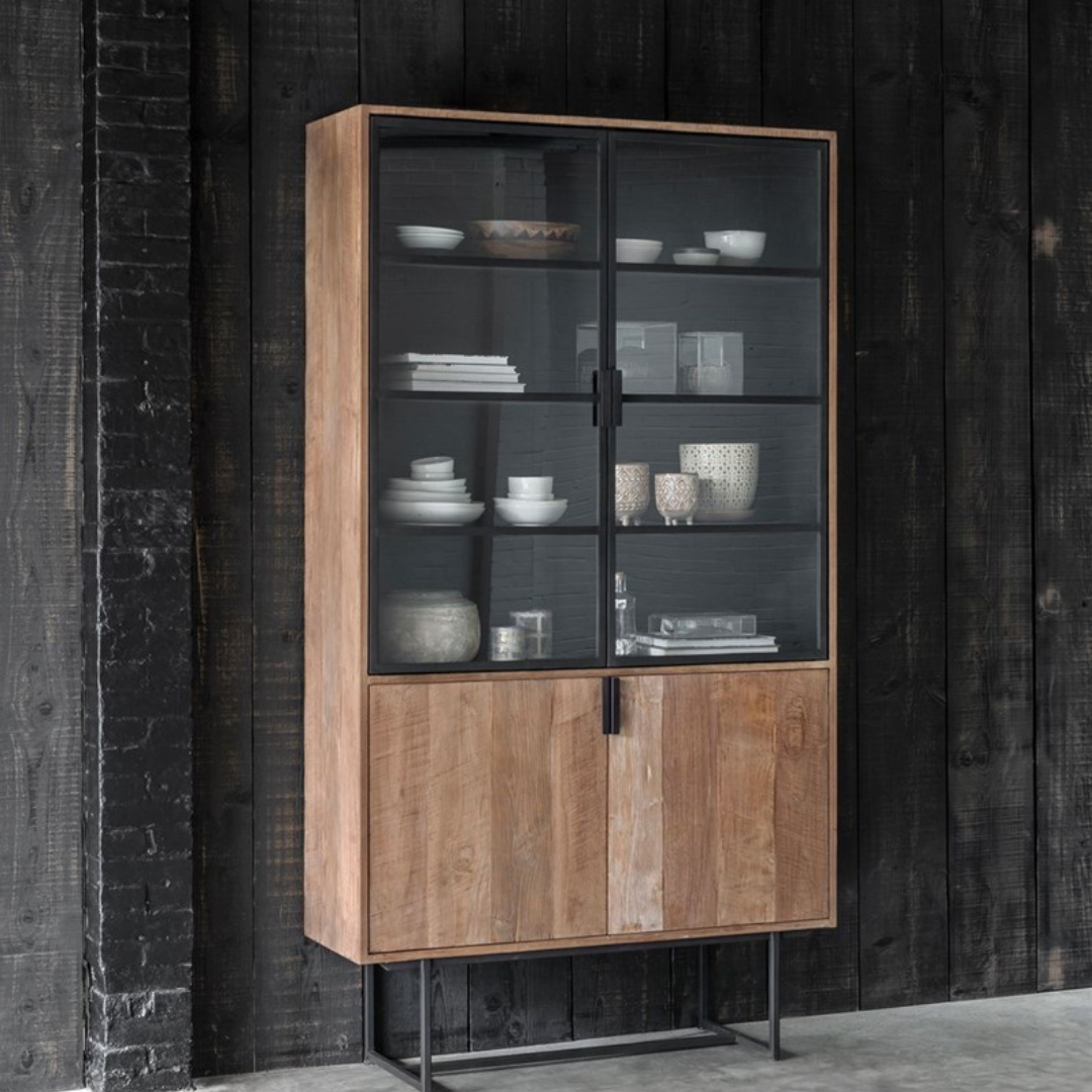 Tyylikäs puinen vitriinikaappi mustilla metalliovilla. Rouheasti viimeistelty tiikkipinta tuo kotoisuutta ja lämpöä sisustukseen. Mustat metalliovet toisaalta henkivät modernia teollista tyyliä. Kaksi mustaa metalliovea, joiden sisällä kaappitilaa ja hyllyt. Erittäin monikäyttöinen, helppohoitoinen ja näyttävä säilytyskaluste, joka käy niin eteisen kaappina, olohuoneessa tai vaikka vaatekaappina.