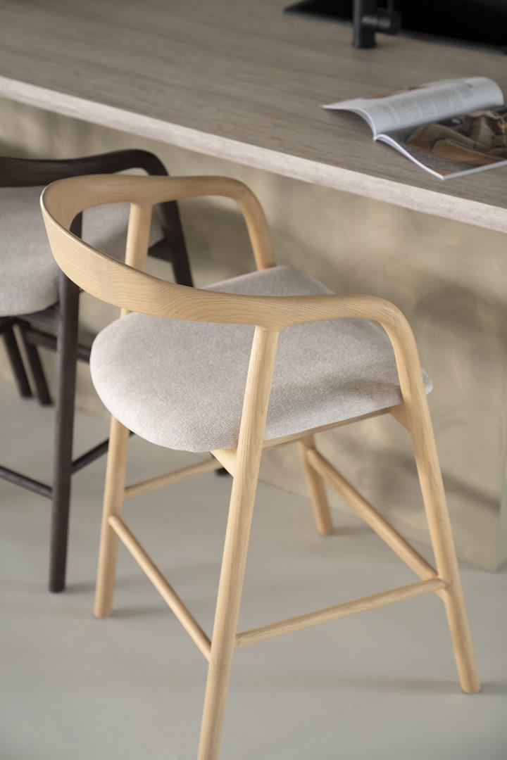 Puurunkoinen baarituoli saarekekorkuiselle pöydälle tai keittiön saarekkeelle. Istuin on mukavasti päällystetty ja välipuulle on hyvä nostaa jalat, joten istuminen on miellyttävää pidemmänkin aikaa. Puurungon selkänoja lisää miellyttävää istumiskokemusta, kun selällekin on hyvä tuki. Saatavilla myös tummemmat sävyt, sekä tilauksesta myös korkeampi baarituoli.