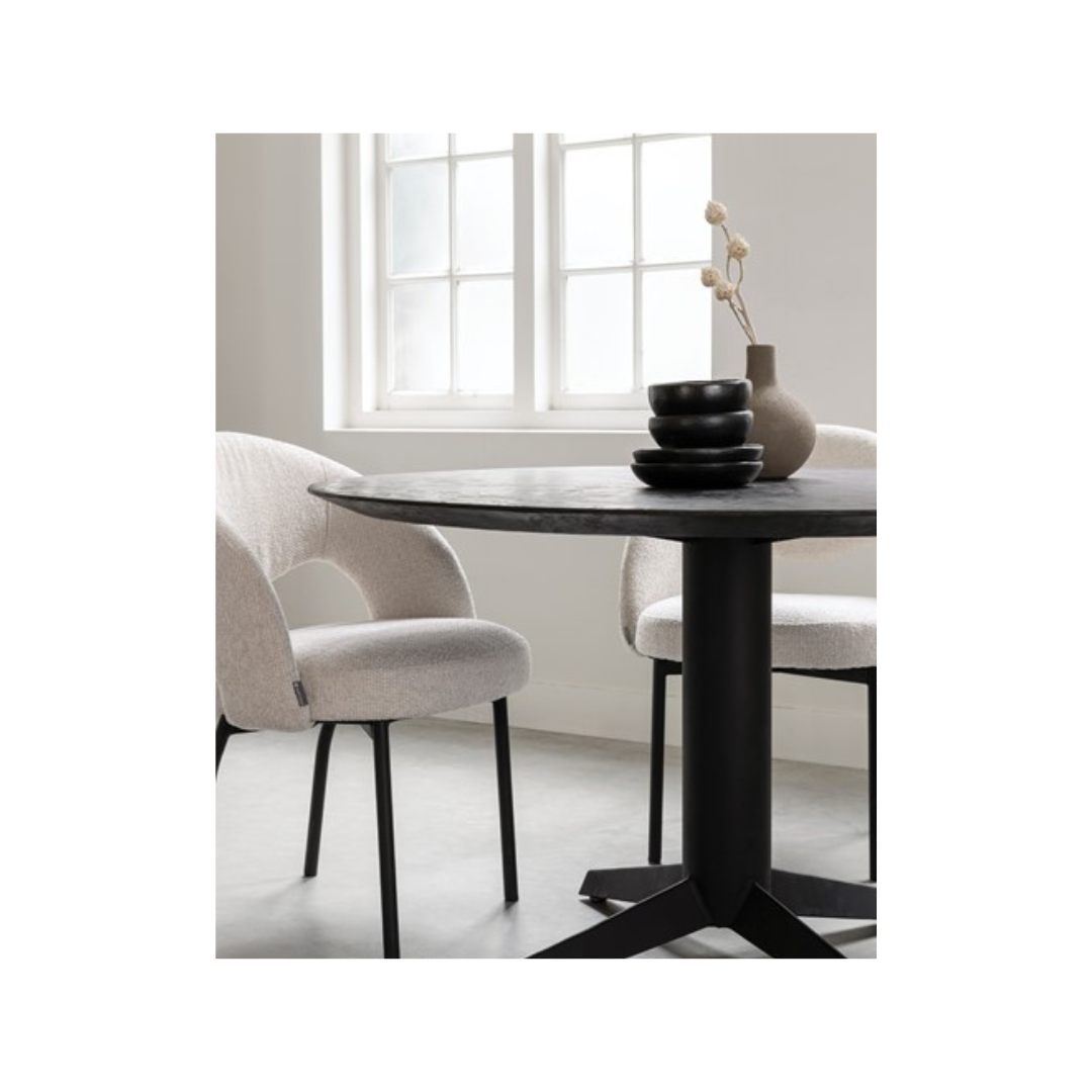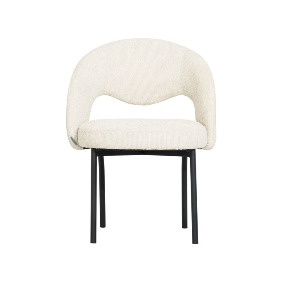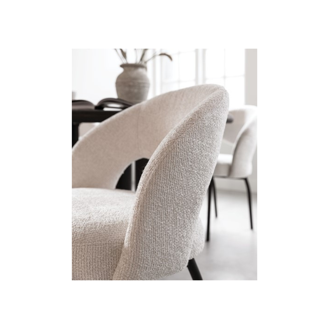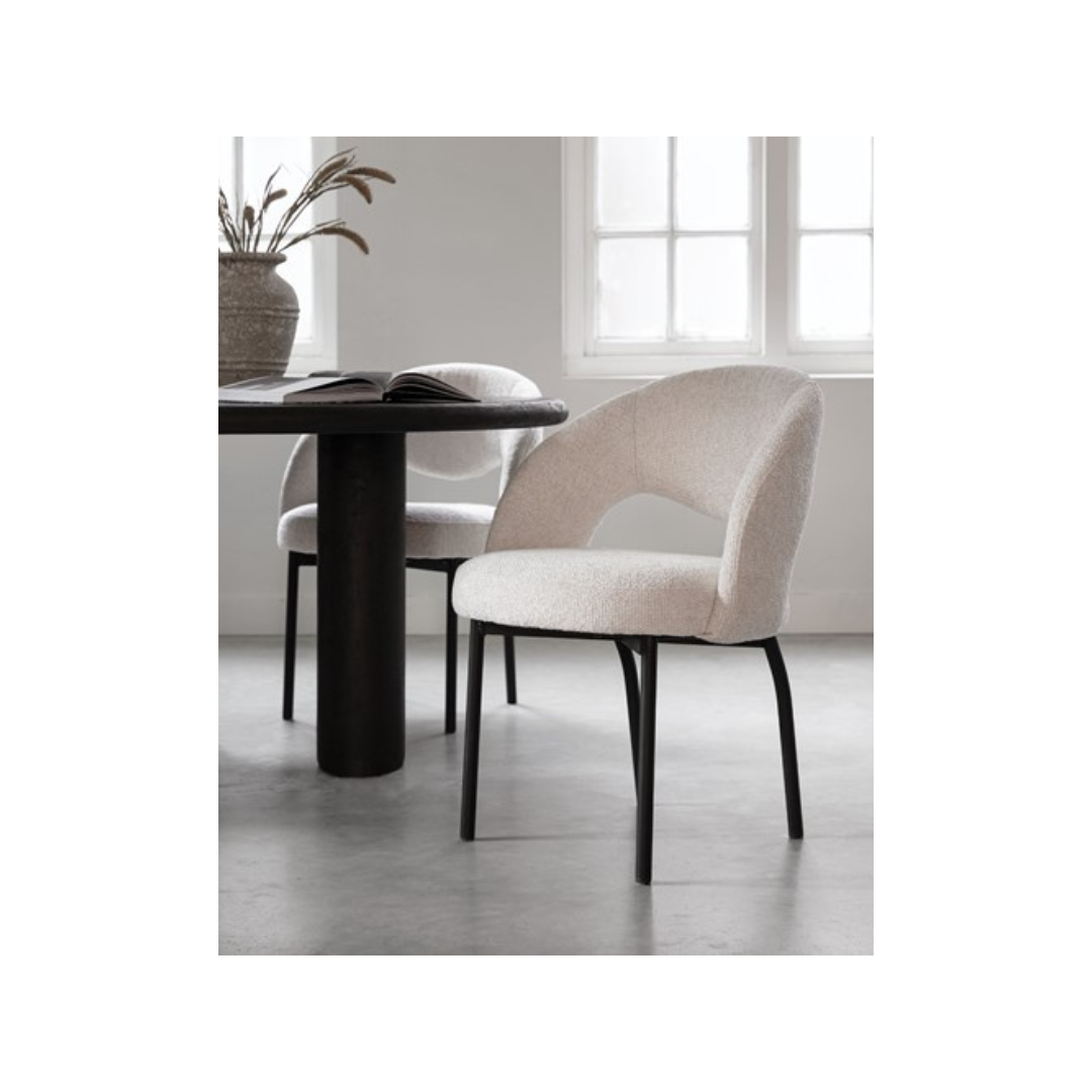 Must Living ruokapöydän tuoli ihastuttaa luonnonvalkoisella pehmeällä istuimella ja kuitenkin tukevalla muotoilullaan. Nojatuolimainen leveä tuoli kannustaa istumaan pidempääkin iltaa ja tuo sisustukseen lämpöä ja luonnollisuutta. Mustat metallijalat tarjoavat tyylikästä kontrastia ja varmistaa tuolin tukevuuden.