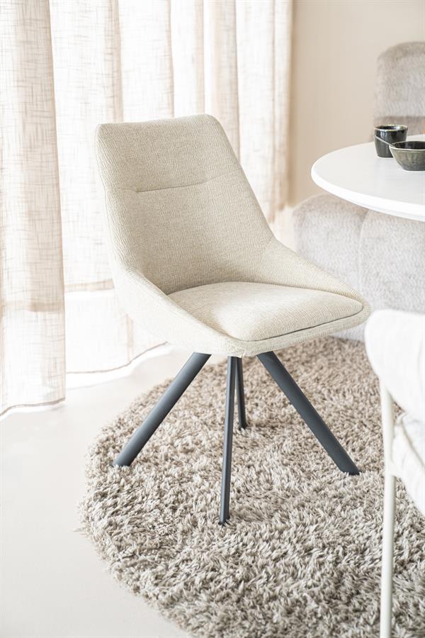 Beige pyörivä ruokapöydän tuoli sametinpehmeällä kangasistuimella. Pehmoinen, mutta helppohoitoinen kangasverhoilu yhdistettynä trendikkääseen mustaan pyörivään metallirunkoon takaa loistavan istuinmukavuuden ja ylelllisen ruokailuryhmän. Tyylikäs taupe väri tuo elenganttia tyyliä sisustukseen tai toimistoon. Kerää ruokapöydän ympärille tai pehmennä toimiston tunnelmaa, yhdistele eri värejä tai muita BY-BOOn tuolimalleja.