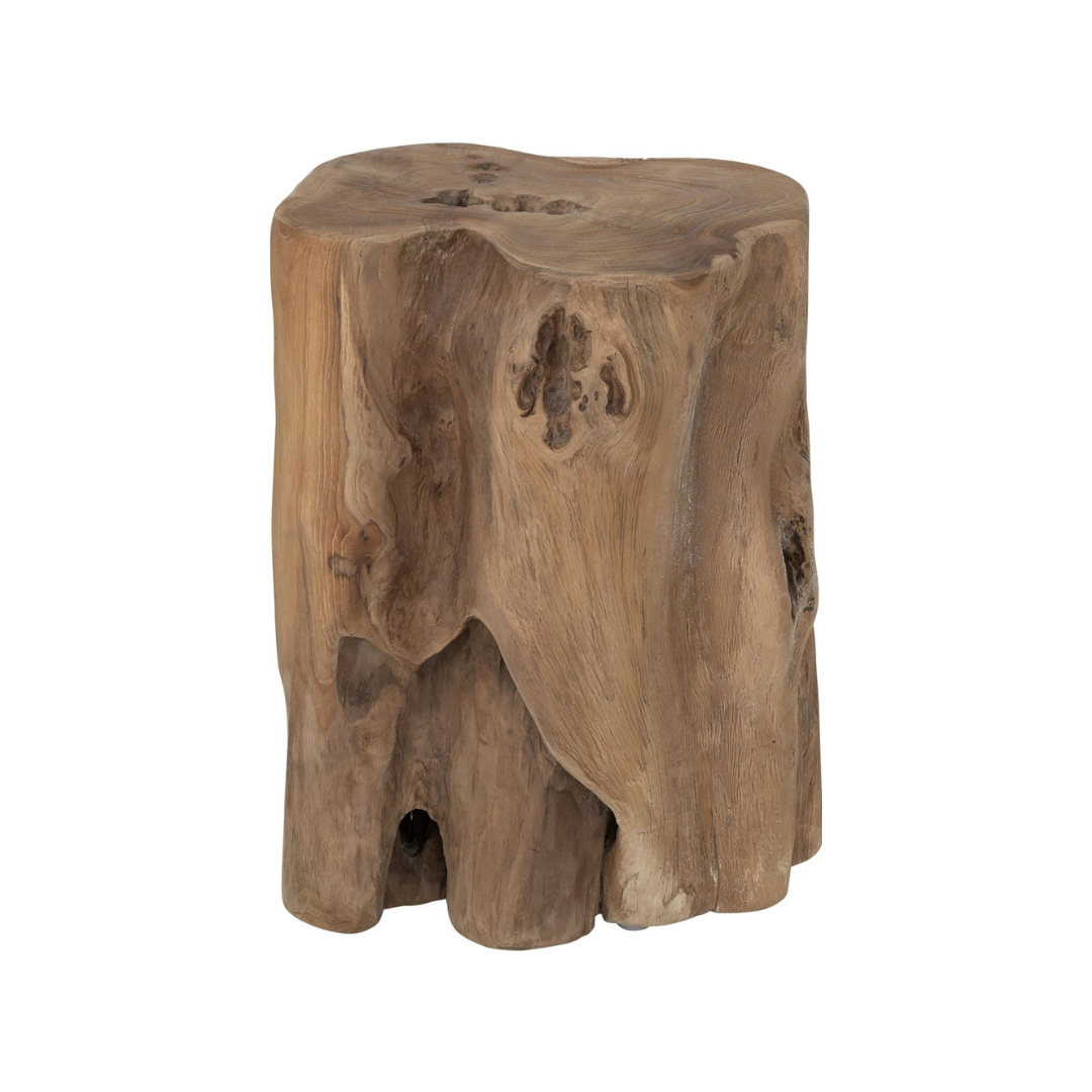 Tämä pyöreähkö epäsymmetrinen pikkupöytä on upea sisustuselementti moneen käyttöön. Puu on jätetty luonnolliselle pinnalle ja käsittelyssä on pyritty tuomaan esille jokaisen uniikin puupöllin hienot syyt ja kuviot. Pikkupöytä toimii kätevänä sohvapöytänä, sivupöytänä tai vaikka kukkapöytänä tai jakkarana. Tiikkipuun juurikiekko tuo jännää muotoa ja luonnollista kotoisuutta moderniinkin kotiin tai mökille.
