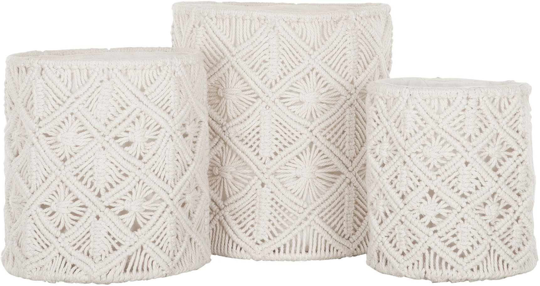 Kauniisti makramee -tyylillä letitetyt boho korit sopivat säilytykseen, somisteeksi tai suojaruukuksi. Sopiva setti monenlaisten kodin tavaroiden säilytykseen. Luot myös helposti harmoniaa käyttämällä samanlaisia koreja kodin eri säilytystarpeille.