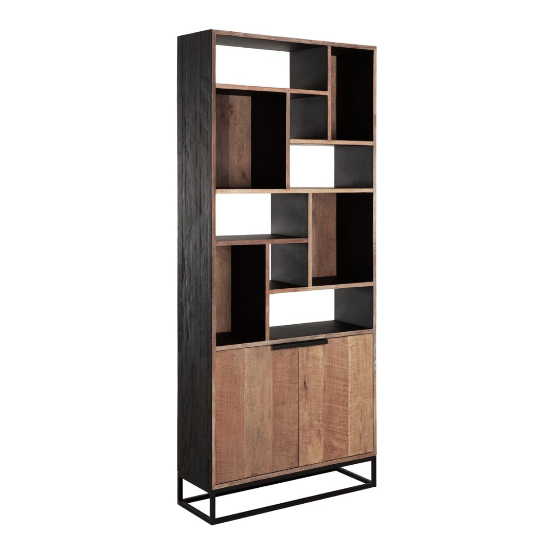 Upean näyttävä leveä puinen kirjahylly 10 epäsymmetrisellä avohyllyillä ja kahdella kaapilla. Laadukas kokopuinen kirjahylly käy niin keittiön astiakaapiksi kuin olohuoneen sisustukseenkin tai lukunurkkaukseen. Hyllykkö kestää niin katsetta kuin käyttöäkin. Sivuille aukeavat tuplaovet.