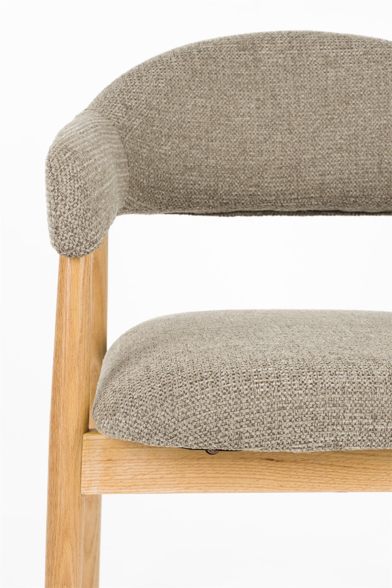 Cosy ruokapöydän tuoli on miellyttävä tuoli pehmeällä istuimella ja tukevalla puurungolla. Käsinojallinen leveä ruokapöydän tuoli kannustaa istumaan pidempääkin iltaa ja tuo sisustukseen lämpöä ja luonnollisuutta. Tammipuiset jalat ja runko yhdistyvät kauniisti tammipuisiin lattiasävyihin ja vaalean ruskea kangas on lempeä sävy.