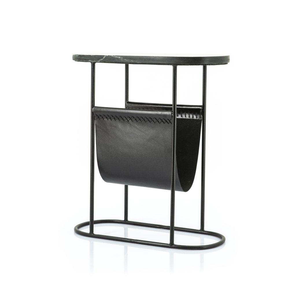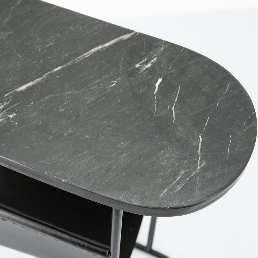 Musta marmorinen sivupöytä pysyy pystyssä kovemmassakin menossa, sillä marmoripöytä on sekä tyylikäs että jämäkkä. Sivupöydän lehtitelineessa säilytät lehdet, mutta myös tietokoneen, tabletin tai kaukosäätimet. Kätevä myös etätyöläiselle vaikka nojatuolin kupeeseen.
