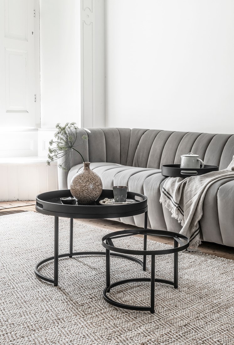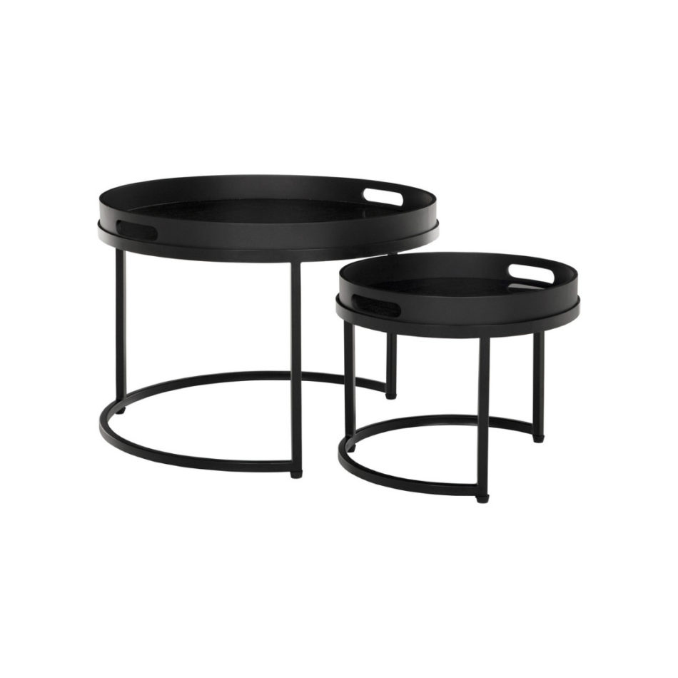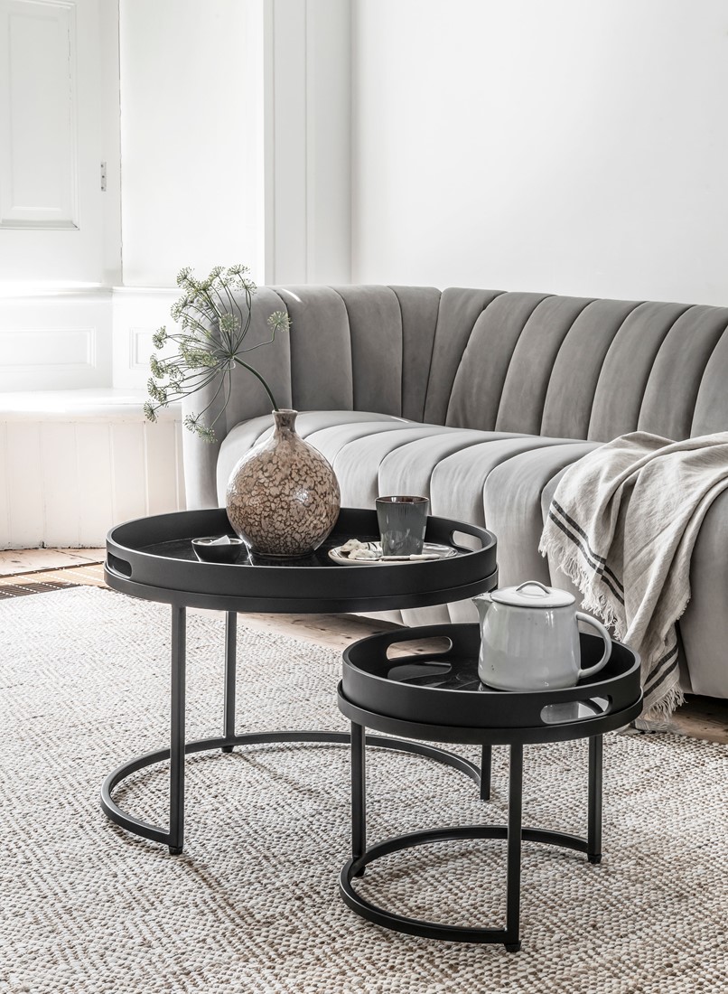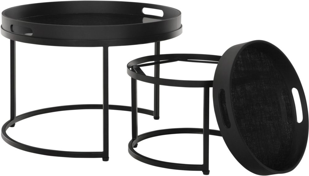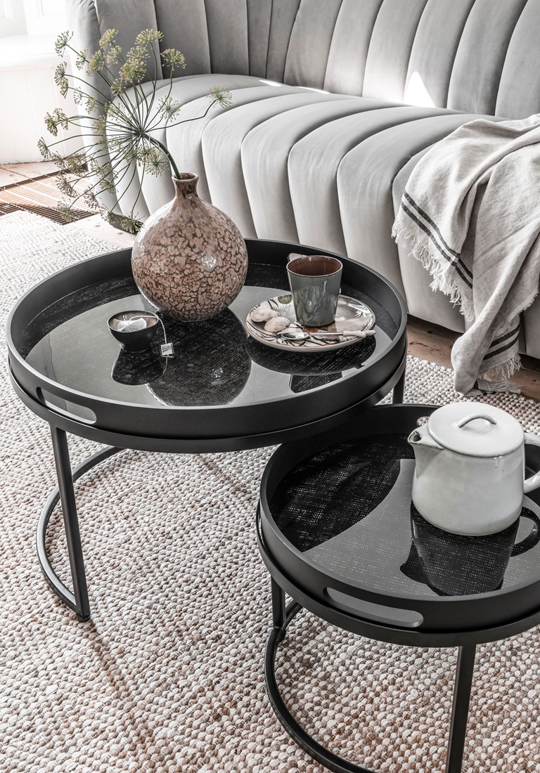 MUST LIVING Fiber sarjapöytä on täydellinen valinta rennon tyylikkääseen sisustusmakuun. Pöydässä on upeita hienoja yksityiskohtia, kuten irralliset pöytälevyt, jotka voi kätevästi irrottaa tarjottimiksi. Mustarunkoisen pöydän tarjotinosa on lasitettua mustaa juuttikangasta, joka lähemmin tarkasteltuna on mielenkiintoinen yksityiskohta kiiltäväpintaisessa pöydässä. Mielenkiintoisella tavalla erittäin käytännöllinen olohuoneen pöytä. Myydään kahden pöydän settinä sarjapöytänä.