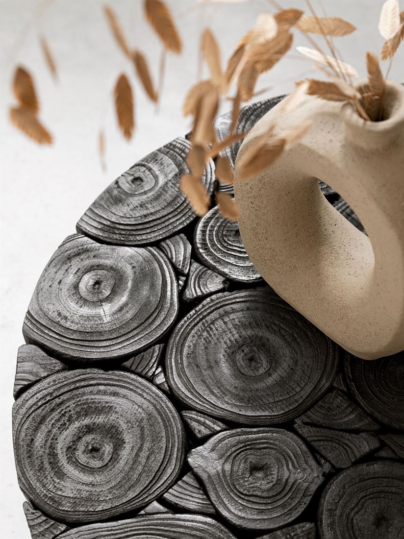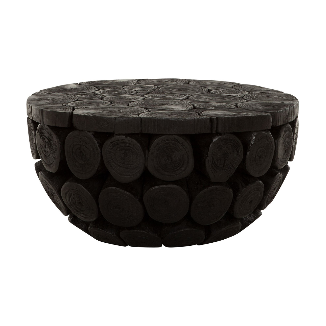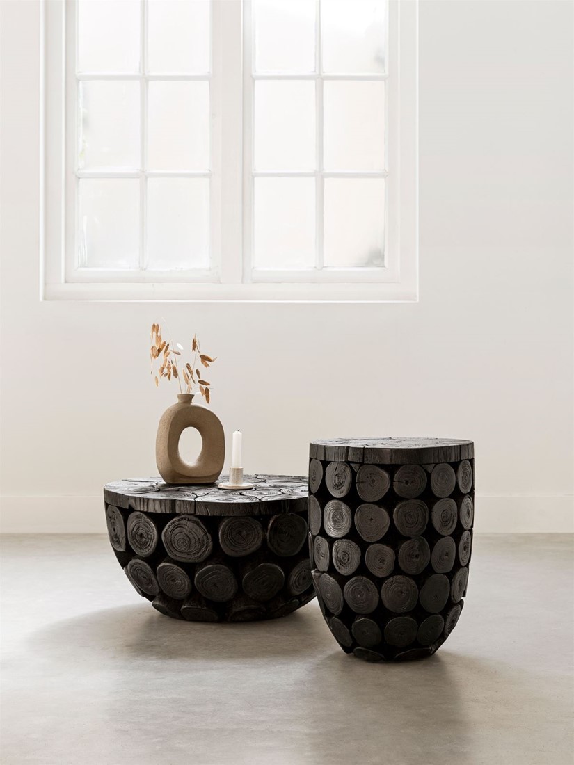 Tämä pyöreä musta sohvapöytä on upea sisustuselementti kotiisi. Mustaksi käsitelty pehmeälinjainen pyöreä sohvapöytä tuo kotiisi uniikin ripauksen luontoa tyylikkäällä tavalla. Tiikkipuun juurikiekoista tehty, hienosti kävyn muotoa seuraava olohuoneen pöytä tuo luonnollista kotoisuutta moderniinkin kotiin tai mökille. Rouhea vintagepuu on hiilikäsitelty niin että puu on kokonaan musta.