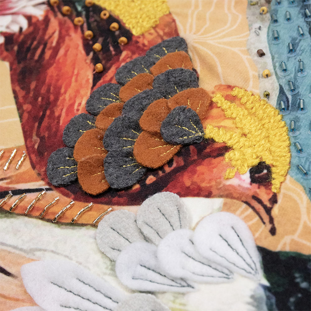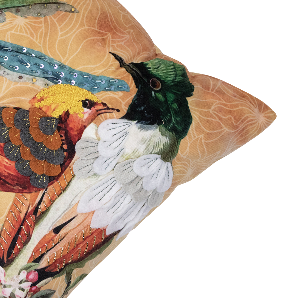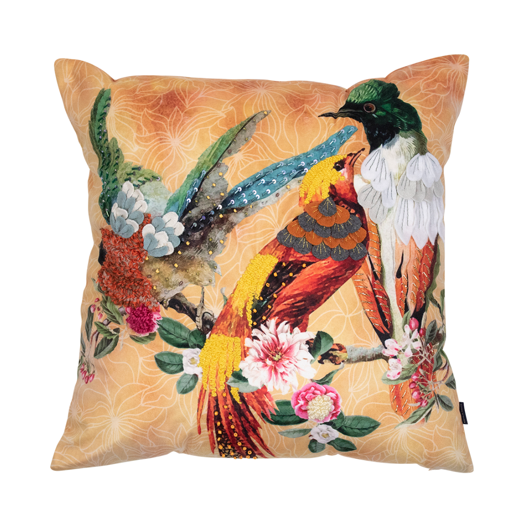Ylellinen käsinkoristeltu värikäs sisustustyyny hurmaavilla lintuaiheilla. Raikkaat persikänsävyiset värit ja iloa tuovat kukkaislinnut on painettu tyynykankaaseen. Höyhenet ja muut yksityiskohdat on sommiteltu käsin tyynynpäälliseen tuoden upean kolmiulotteisen vaikutelman. Irrotettava sisätyyny sisältyy. Pesu 30 ’C.