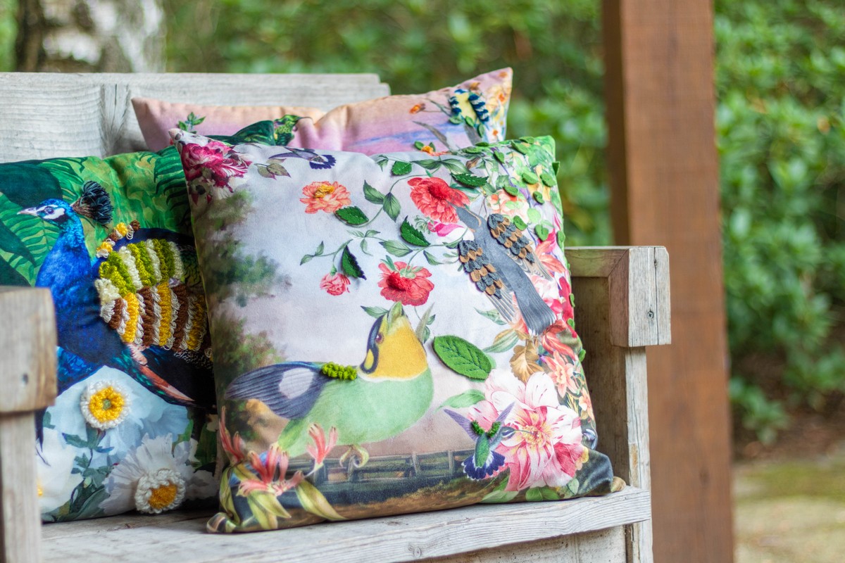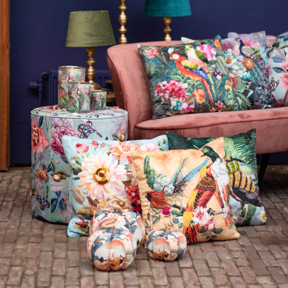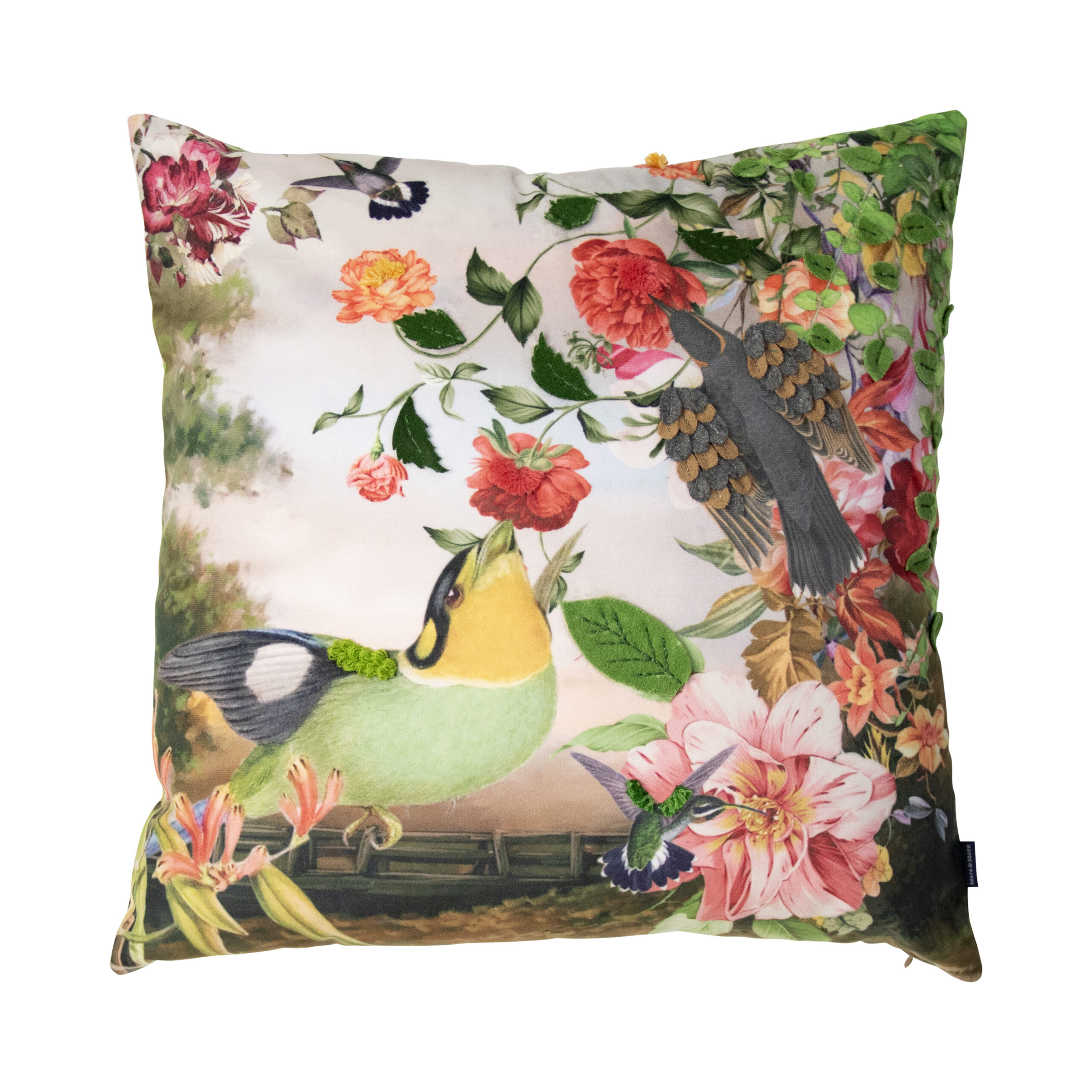 Ylellinen käsinkoristeltu värikäs sisustustyyny hurmaavan iloisella lintuaiheella. Raikkaat vihreänsävyiset värit ja iloa tuova lintu kukkien keskellä on painettu tyynykankaaseen. Höyhenet ja muut yksityiskohdat on sommiteltu käsin tyynynpäälliseen tuoden upean kolmiulotteisen vaikutelman. Irrotettava sisätyyny sisältyy. Pesu 30 ’C.