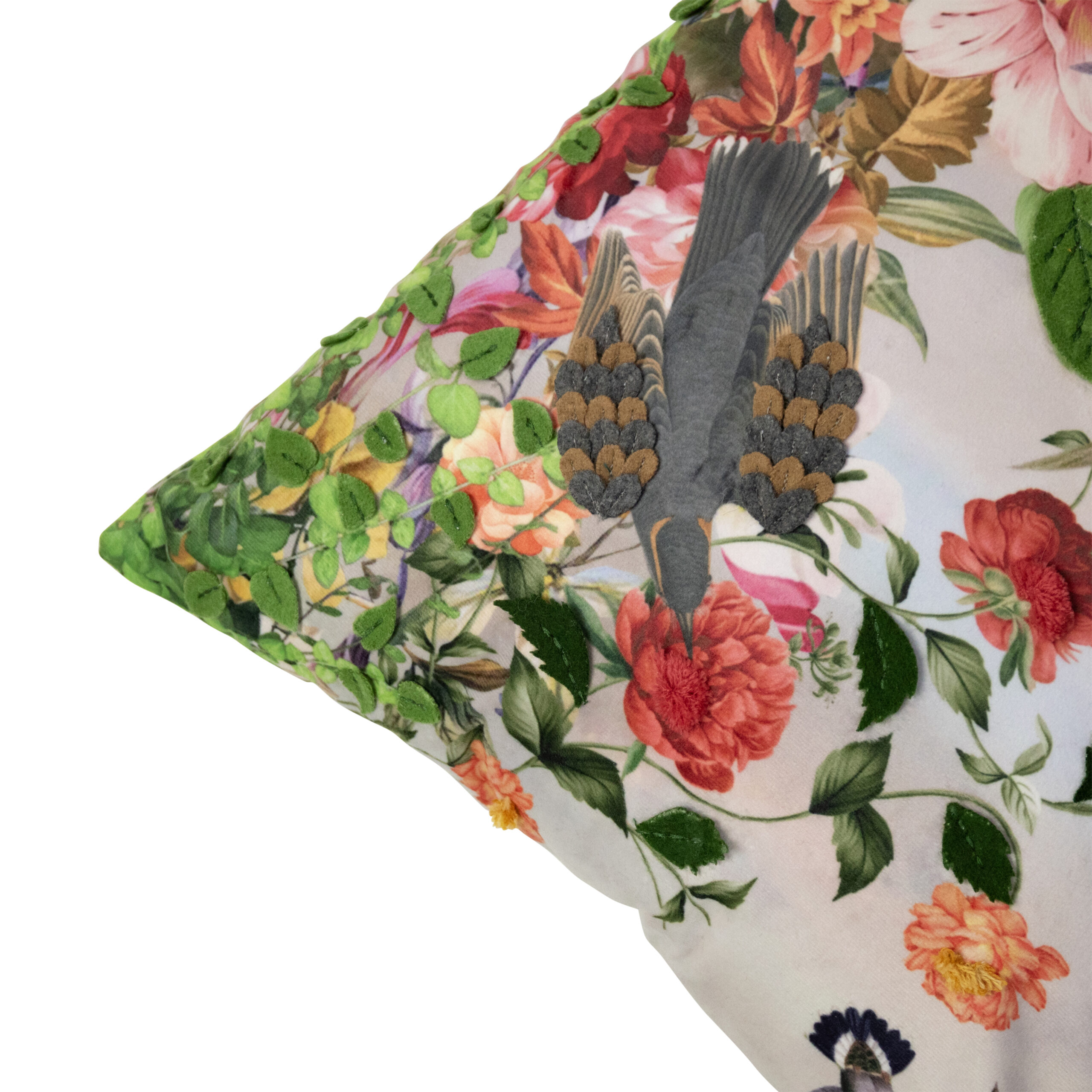 Käsinkoristeltu sisustustyyny 45×45, kukkaislintu