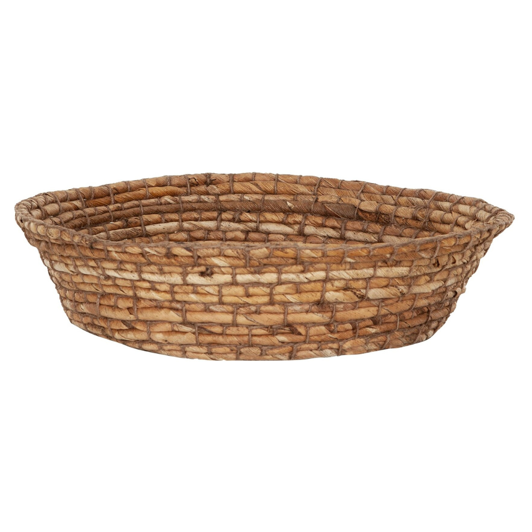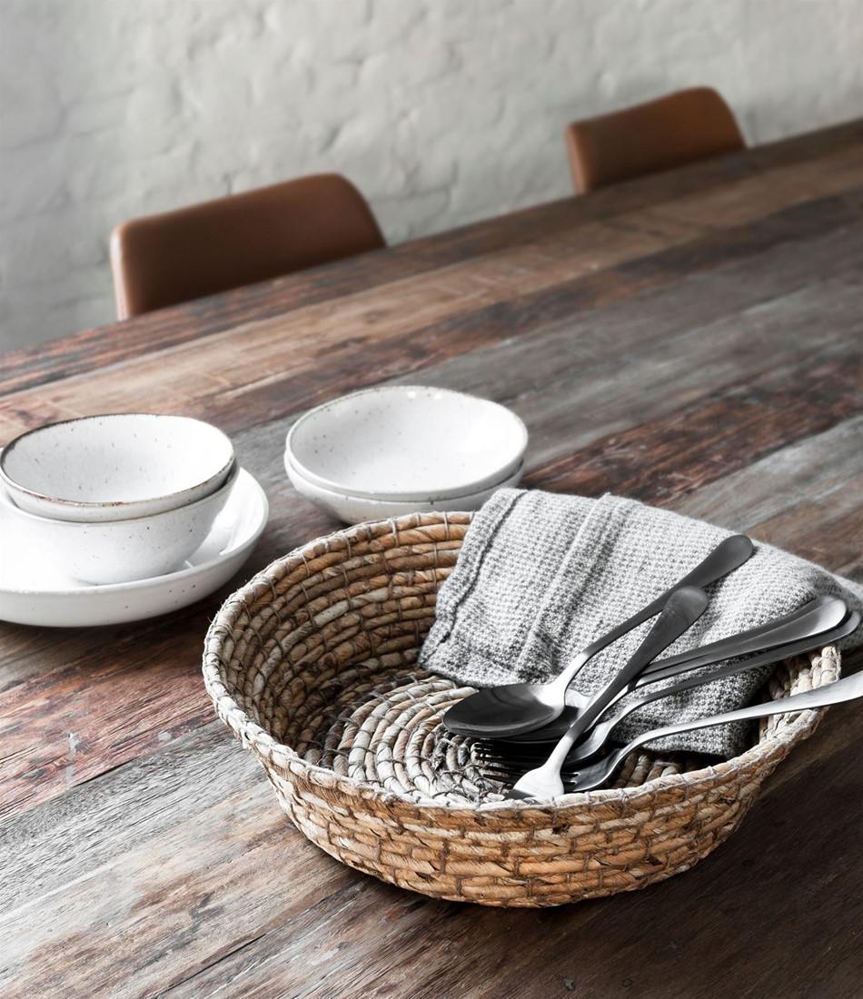 Käsinpunottu leipäkori kauniiseen kotiin niin leivän tarjoiluun kuin pikkutavaroiden säilytykseenkin somisteeksi. Renon tyylikkään kattauksen saat käyttämällä lautasliinaa korin suojana.