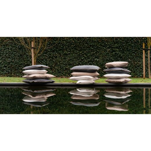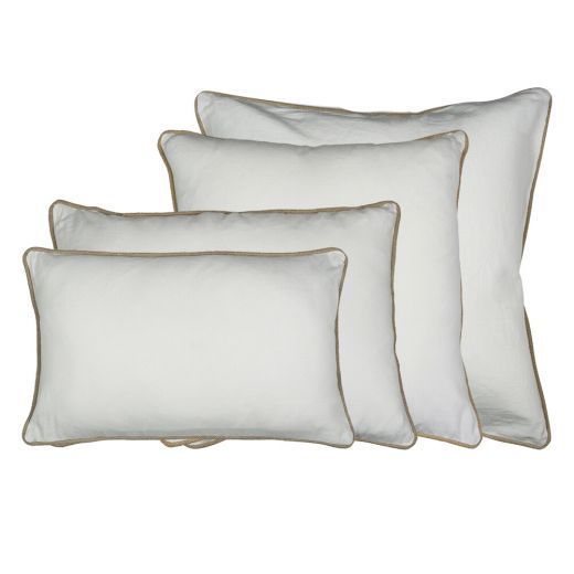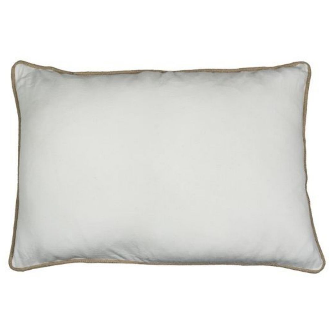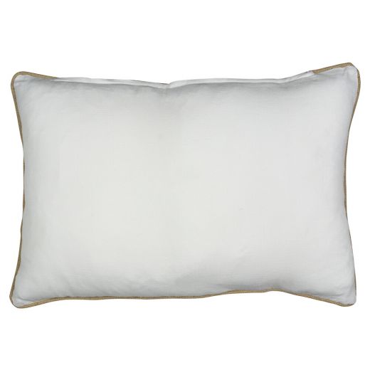Valkoinen ulkotyyny terassin tai parvekkeen sisustukseen. Ulkokäyttöön sopiva tyyny on tehty kosteutta kestävistä materiaaleista ja voit huoletta sisustaa sillä ulkona. Kaunis naturel-värinen punosreunus kiertää tyynyn kantteja. Sisätyyny sisältyy.