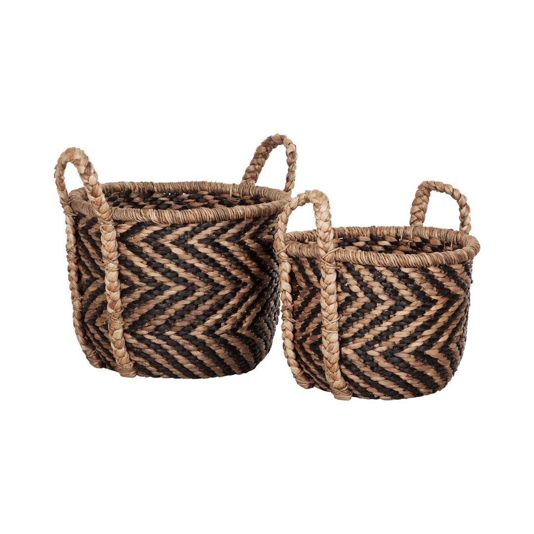 Näihin koreihin mahtuu! Näyttävät isot säilytyskorit kätkevät kauniisti sisälleen huovat, tossut, lelut tai vierastyynyt. Koska vahva vesihyasinttipunos ei näytä lävitse, voit myös kätkeä koreihin tavaraa, jonka et niin toivo olevan näkösällä, kuten vaikka johdot. Vahvasta vesihyasintista käsinpunottu kori sopii niin säilytykseen, somisteeksi kuin suojaruukuksikin. Luot myös helposti harmoniaa käyttämällä samanlaisia koreja kodin eri säilytystarpeille. Zigzag kuvio sopii hyvin yhteen kalanruoto -kuvioinnin kanssa.