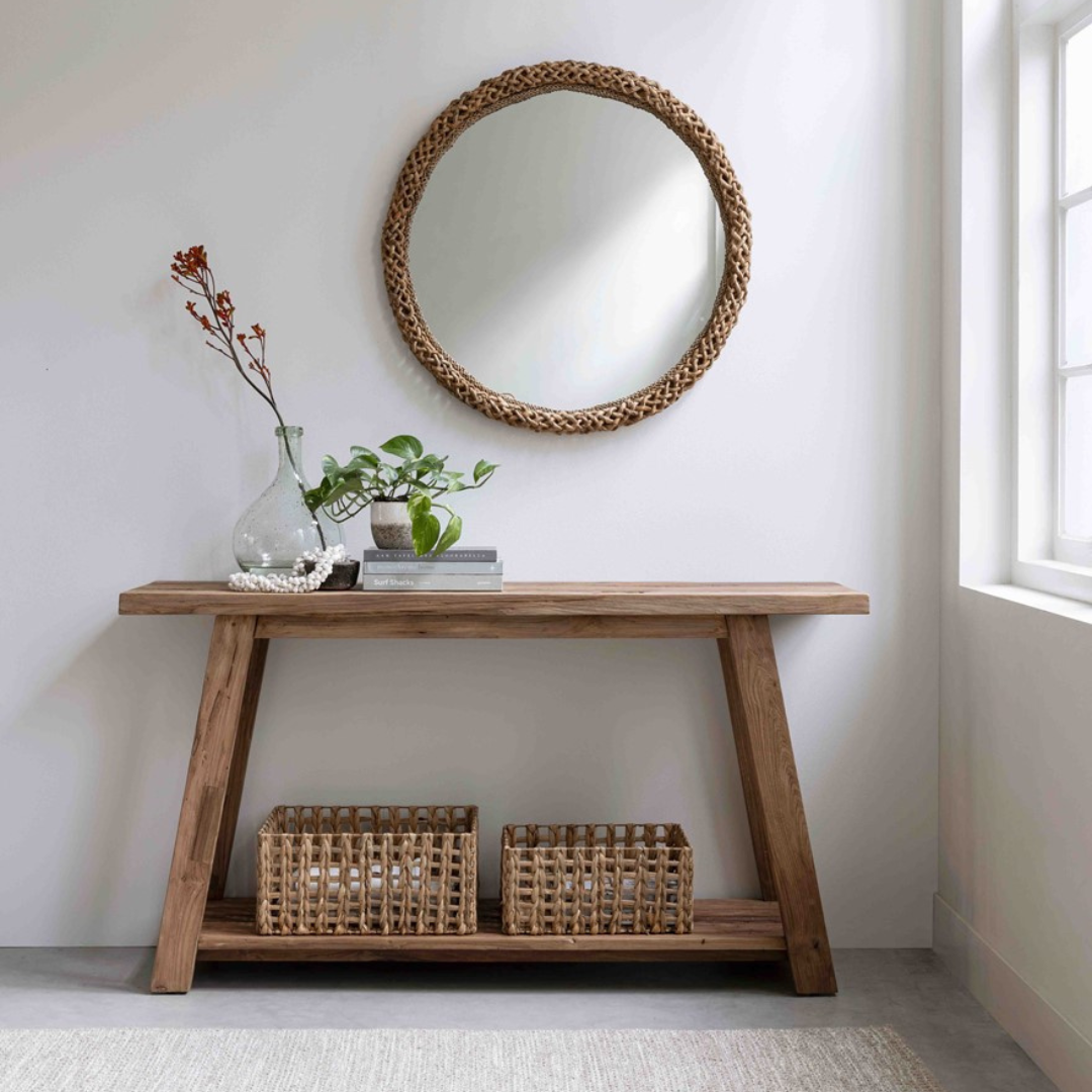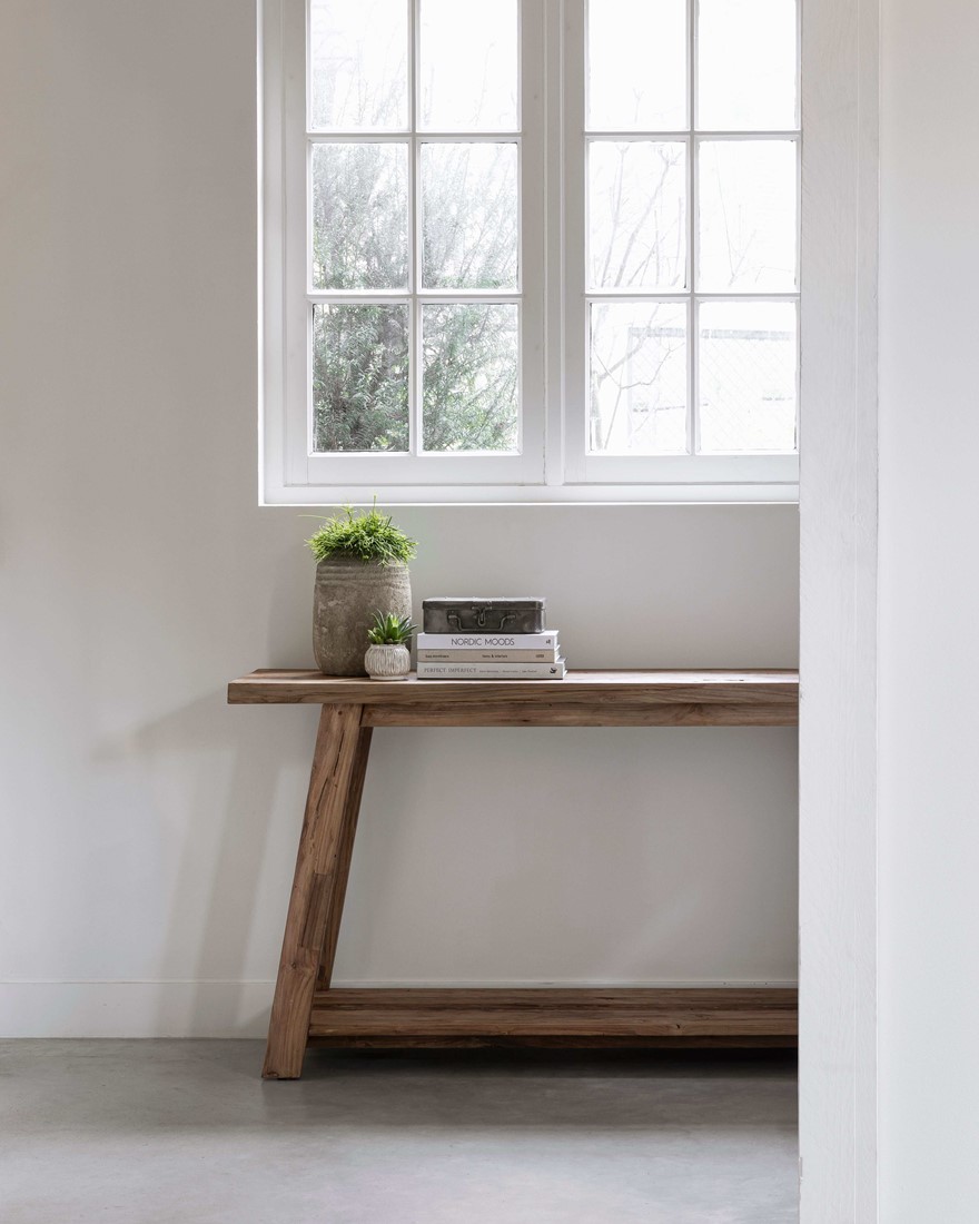 Mallistomme konsolipöydät on valmistettu kestävästä ja laadukkaasta kierrätystiikistä, joka on helppohoitoinen, kestävä ja laadukas materiaali. Puupinta on vahvaa ja sitä on helppo puhdistaa – useimmiten pelkkä pyyhkäisy riittää. Suosittelemme, että pöytää ei käsiteltäisi liikaa, sillä luonnollinen puupinta tuo esiin kauniin ulkonäönsä ilman ylimääräistä käsittelyä.