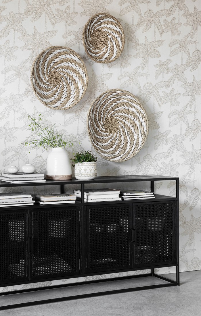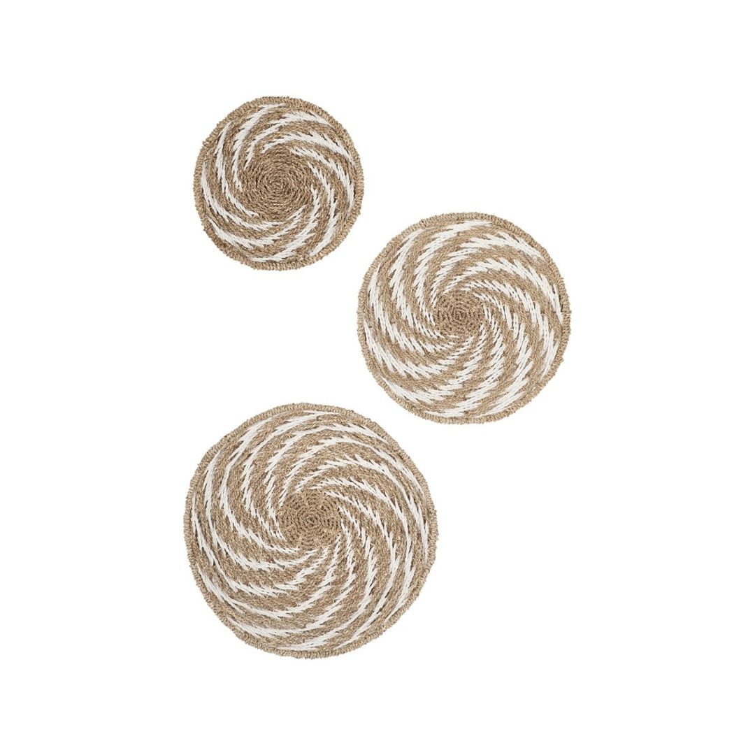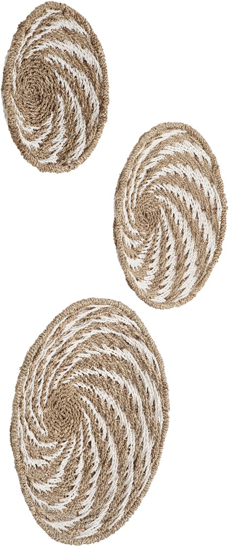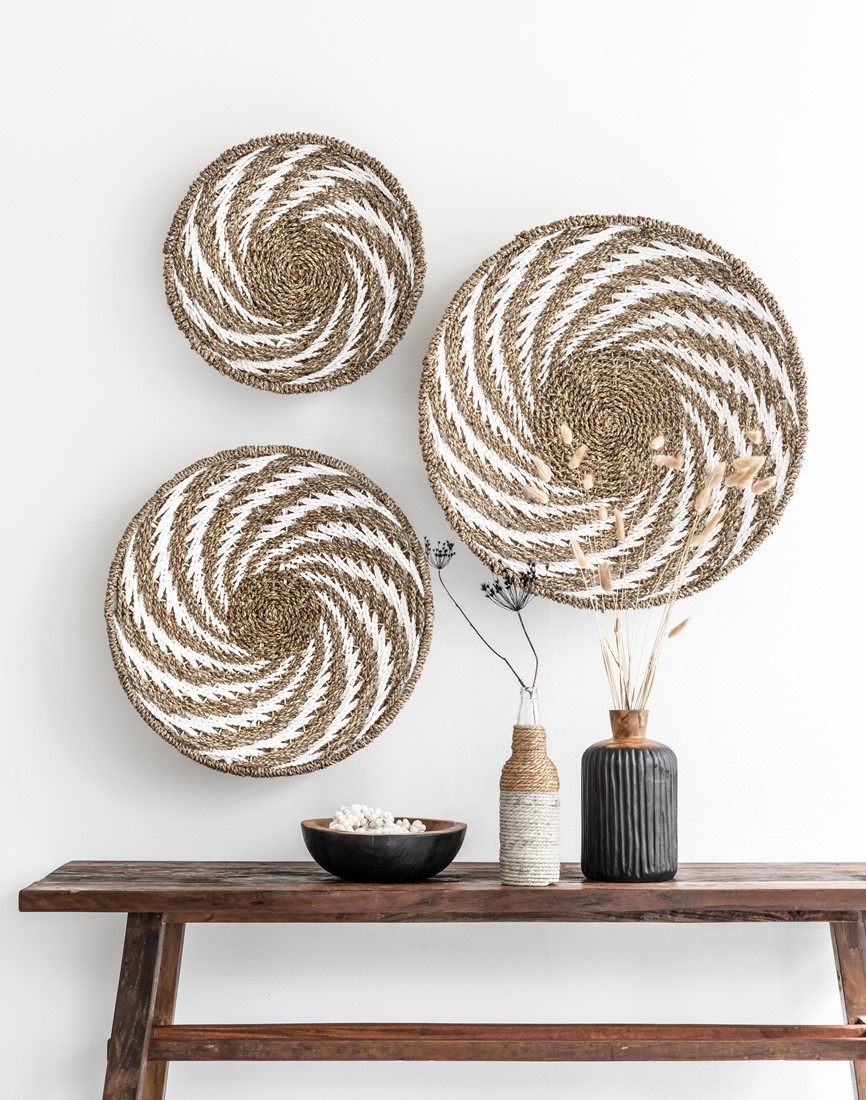 Laadukkaasta ja ekologisesta meriheinästä punottu suuri boho seinäkoriste tuo ylellisen boheemin tunnelman kotiisi. Seinäkoristeet ovat nyt niin pop ja hop, ettei ilman näitä meinaa lähteä tunnelma ollenkaan lentoon! Seinäkoriste koostuu kolmesta erikokoisesta punotusta vadista, ja ne voi asetella omaan tilaan sopivimmin. Takana kiinnityskoukku.