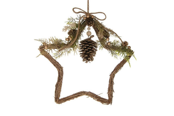 Natural Collections tähti ovikoriste. Kaunis ja huolellisesti tehty tähden mallinen ovikranssi. Tuo kotiin luonnonläheistä vanhan ajan joulutunnelmaa. Kultaiset helmet ja ruskea, kauniisti punottu juuttinaru.