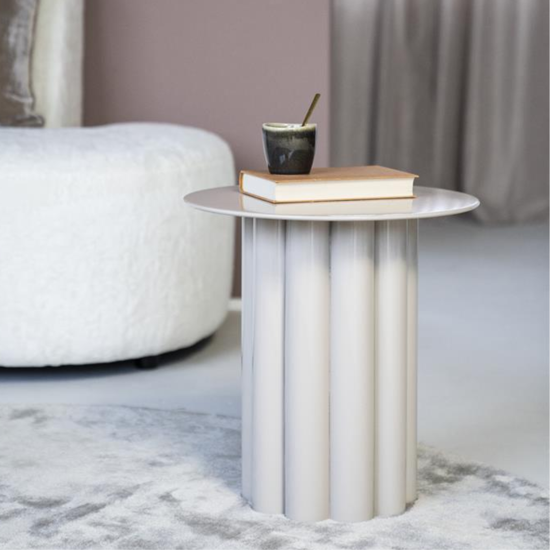 Avainsanat tuotteelle beessi pöytä, beige pöytä, beige sohvapöytä, metallipöytä, pilarimainen pöytä, Pyöreä sohvapöytä, sivupöytä