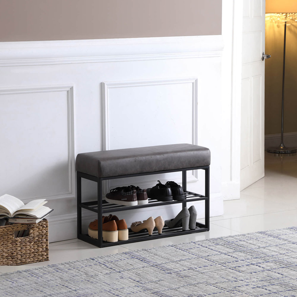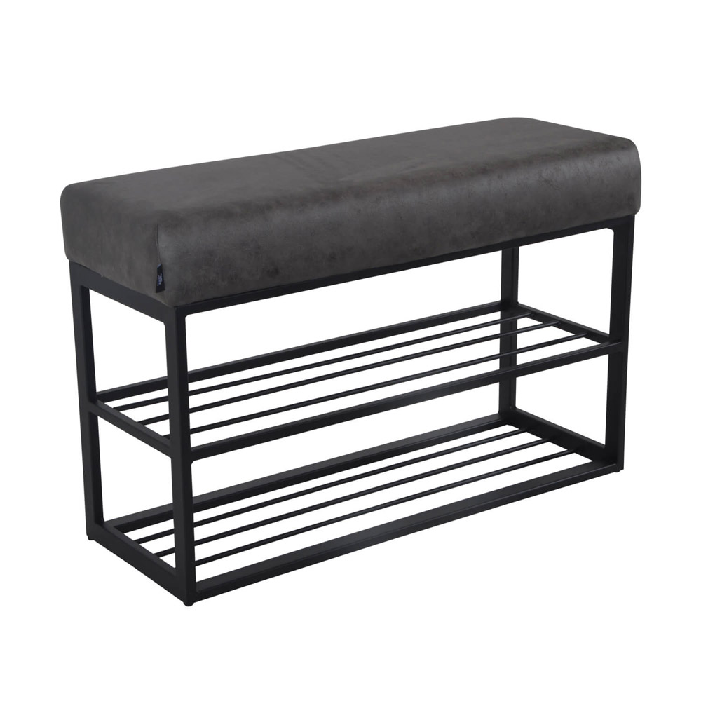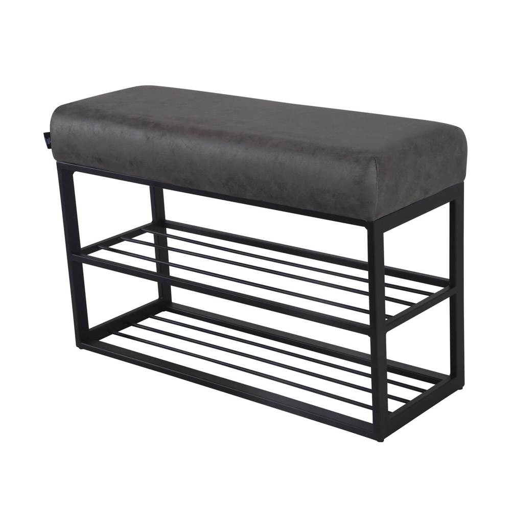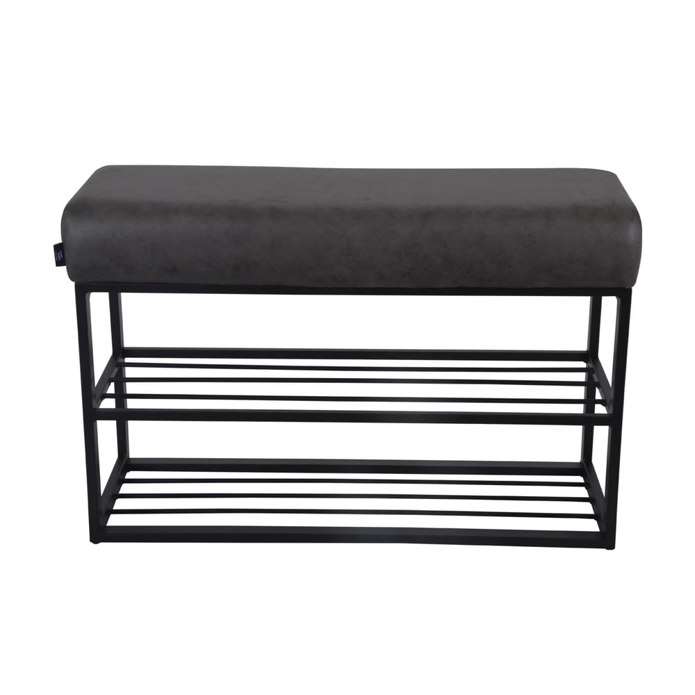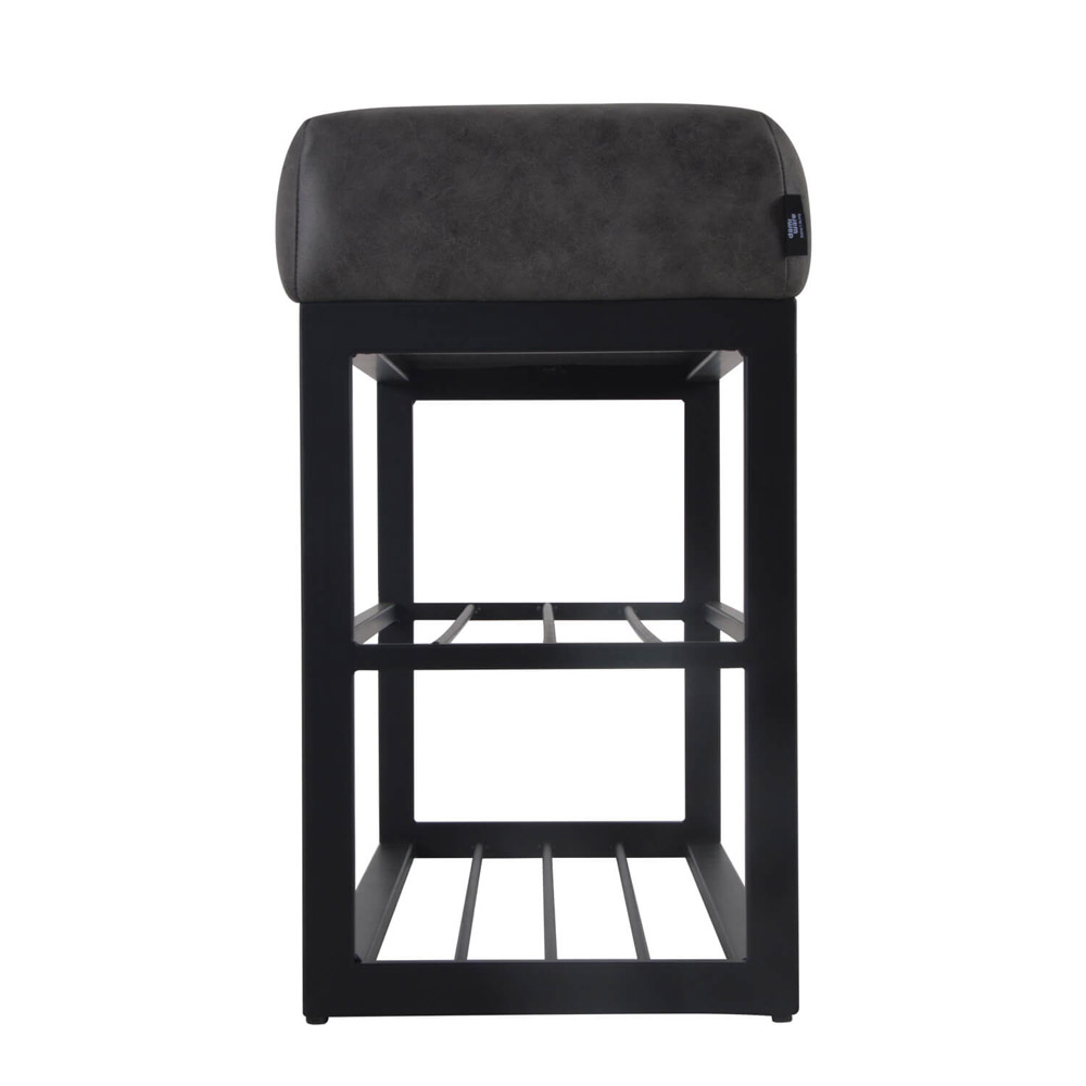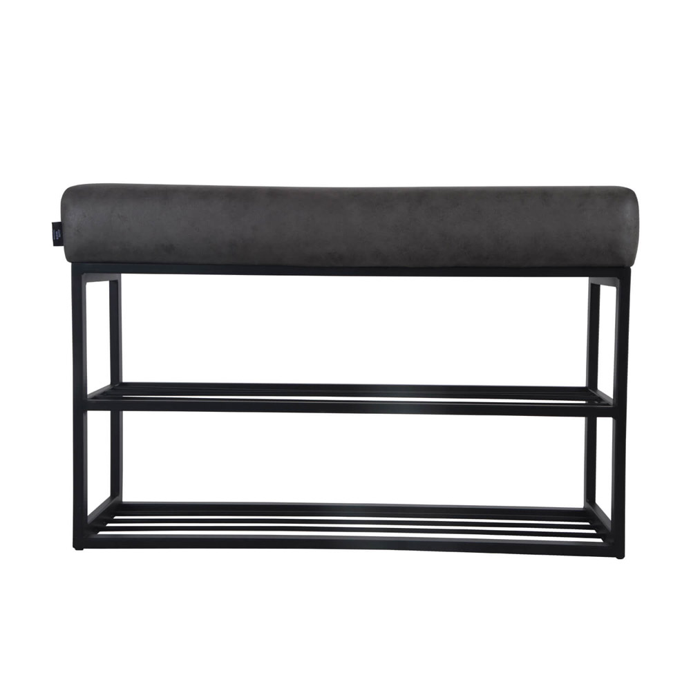 Pehmustettu kenkäteline kahdella kenkätasolla, joka toimii toki monikäyttöisenä myös muissa tiloissa, kuten vaikka vaatehuoneen penkkinä. Tukeva metallirunko, sekä miellyttäväksi pehmustettu penkki vintagenahkaisella istuinosalla, joka on helppo pitää puhtaana. Elävä harmaan väri on käytännöllinen ja kaunis värivalinta.