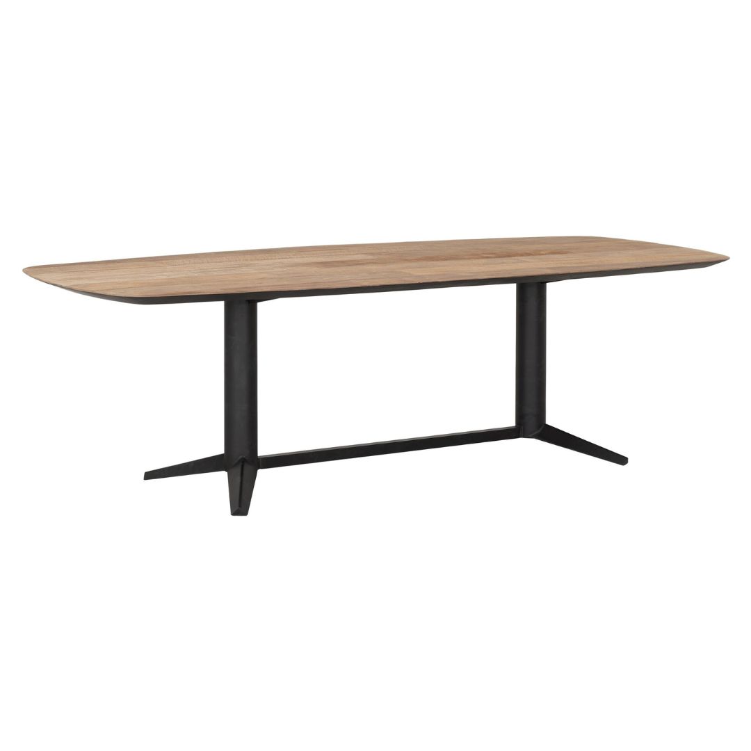 Puinen ruokapöytä vahvoilla mustilla metallijaloilla. Tyylikäs vahva tiikkipuinen pöytälevy, elegantisti viistotettu ruokapöydän alapuoli sekä hieman ovaali muotoilu tekee tästä pöydästä katseenvangitsijan. 8 hengen ruokapöytään kaikki ruokailijat mahtuvat hyvin syömään ja myös enemmän tuoleja sopii tämän pöydän ympärille. Hieman ovaali muotoilu tuo pöydän tilalle myös mukavasti tilaa tarjottaville.