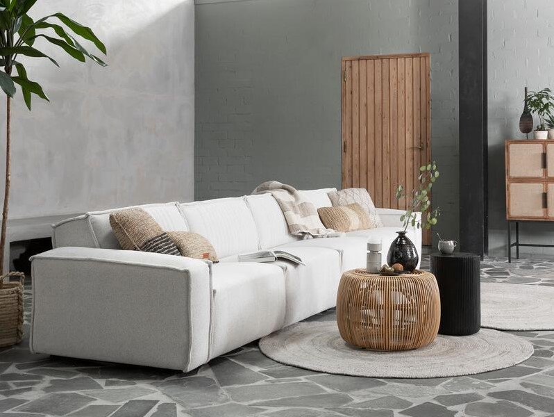 Tyylikäs muhkea beige kuolmasohva vaativaan sisustusmakuun. Iso kulmasohva on mahtava rentoon oleiluun ja sopii kotiisi, kun haluat huoletonta luksusta sisustukseesi. Luonnonvaalea boucklee samettikangas on miellyttävän pehmeä ja istuinosa kuitenkin muhkeanakin jämäkkä istua tai vaikka ottaa torkut. Lämpöä ja kodikkuutta kotiin ja olohuoneen sisustukseen.