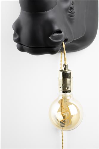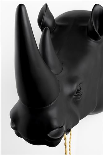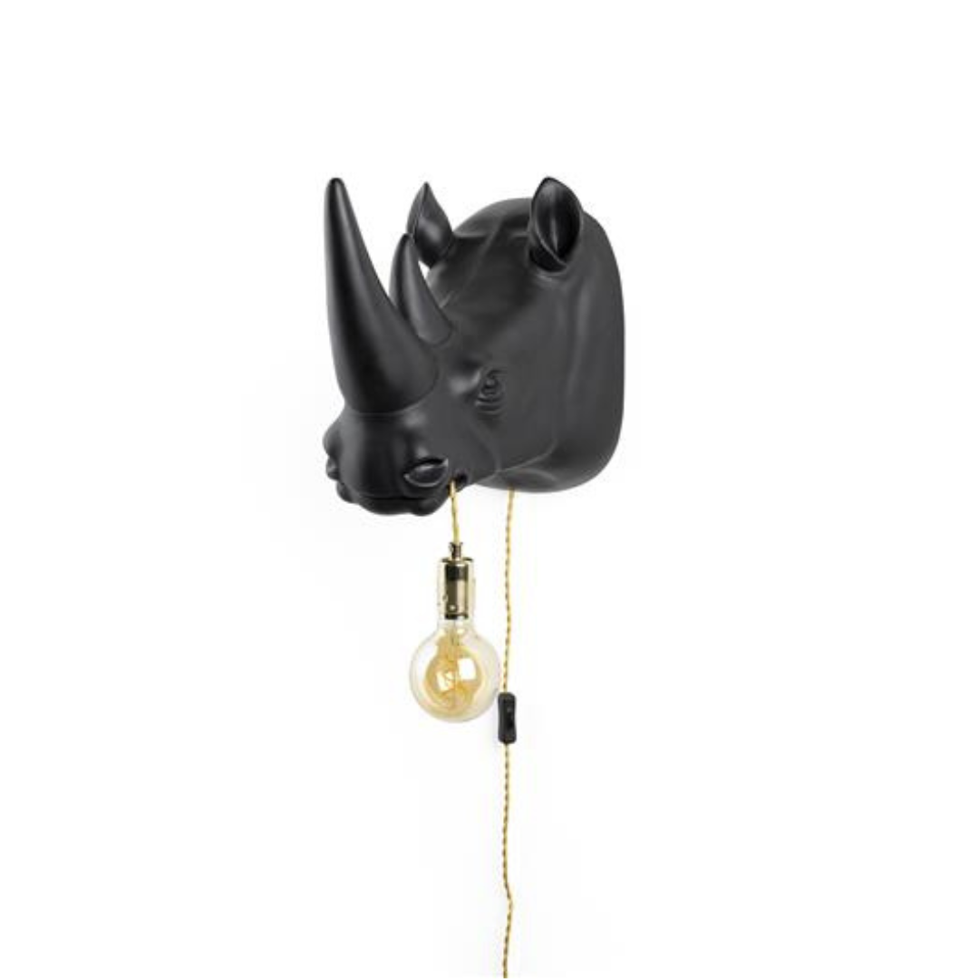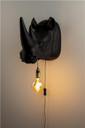 Kun mikään ei riitä.. musta sarvikuono seinävalaisin, joka niin kokonsa kuin näkönsäkään puolesta ei jää huomaamatta! Sarvikuono roikuttaa suustaan lampunjohtoa, johon voit liittää haluamasi polttimon. Musta mattapinta on jylhä näky ja helppo kiinnitys takaa kahdesta pisteestä.