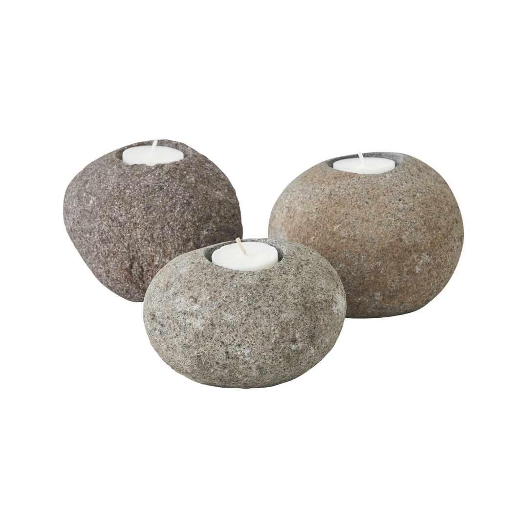 Kauniit jokivirran muovaamat kynttilänjalat tuikkukynttilöille kodin sisustukseen. Kolme kaunista eri kokoista pyöreäksi hioutunutta rantakiveä tuikun mentävällä kololla.