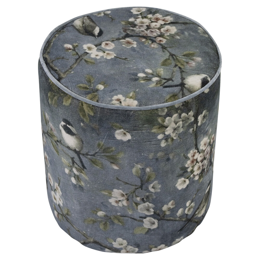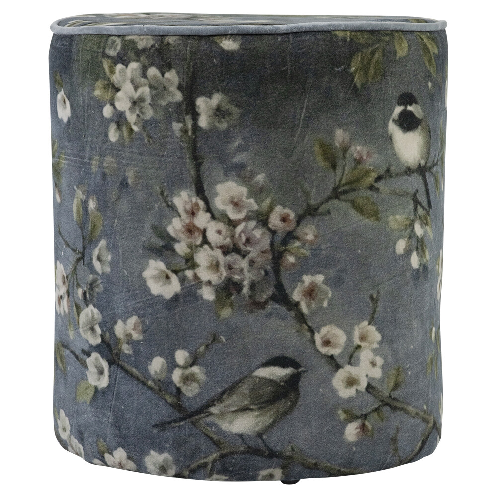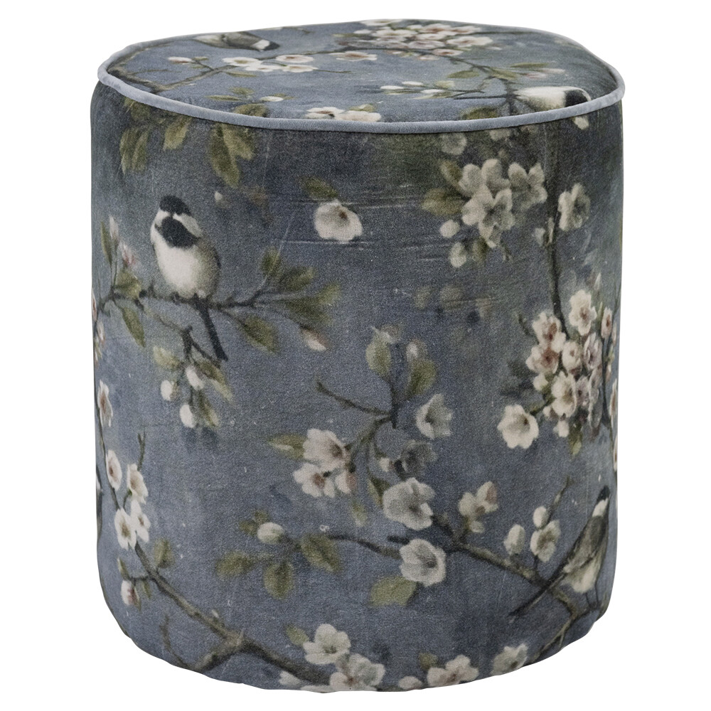 Ihanaa paratiisin tunnelmaa! Sinisen harmaa rahi on miellyttävän pehmeä ja kuitenkin vankka tukeva muotoilu, joka ei lässähdä käytössä vaan säilyttää muotonsa. Kaunis kangas kirsikankukkineen ja pikkulintuineen ihastuttaa.