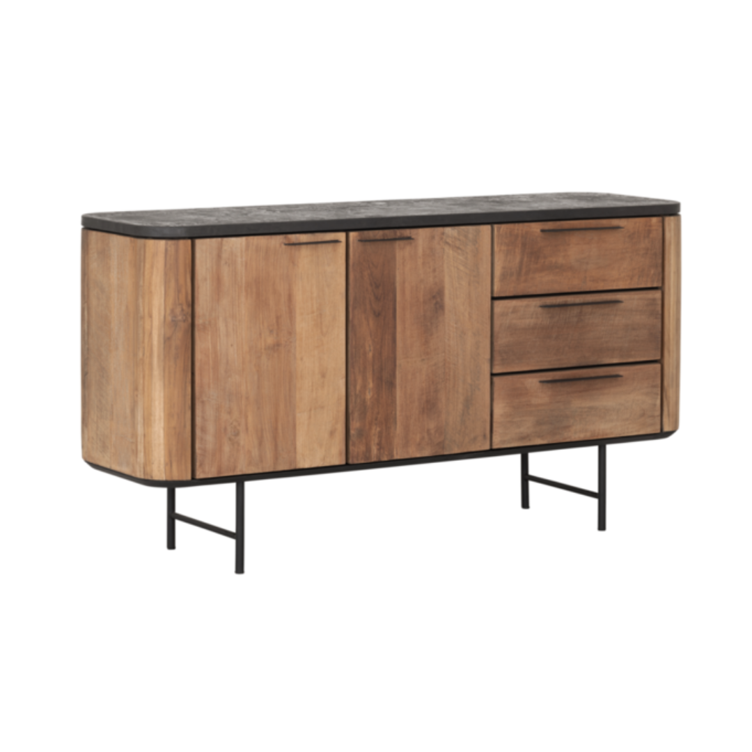 Tyylikäs lipasto, joka on valmistettu ylellisestä kierrätystiikistä sekä mortex kiviaineesta. Kaksi kaapinovea sekä kolme vetolaatikkoa mahdollistavat tavaroiden säilyttämisen piilossa katseilta. Lipasto sopii niin olohuoneeseen, makuuhuoneeseen tai eteiseen katseenvangitsijaksi. Laadukas viimeistelty tiikki sekä kivimäinen mortex yhdessä tekevät tästä kalusteesta upean. Puun lämpö ja kiven näyttävyys samassa paketissa.