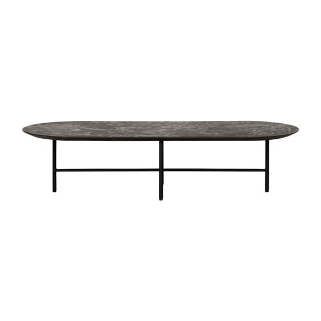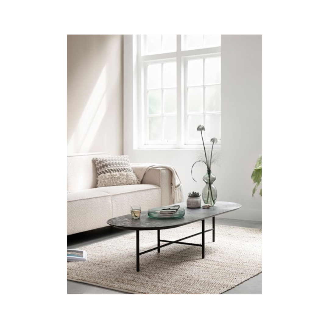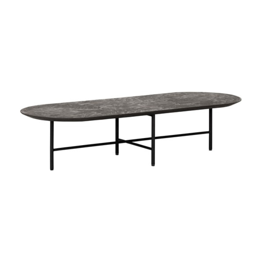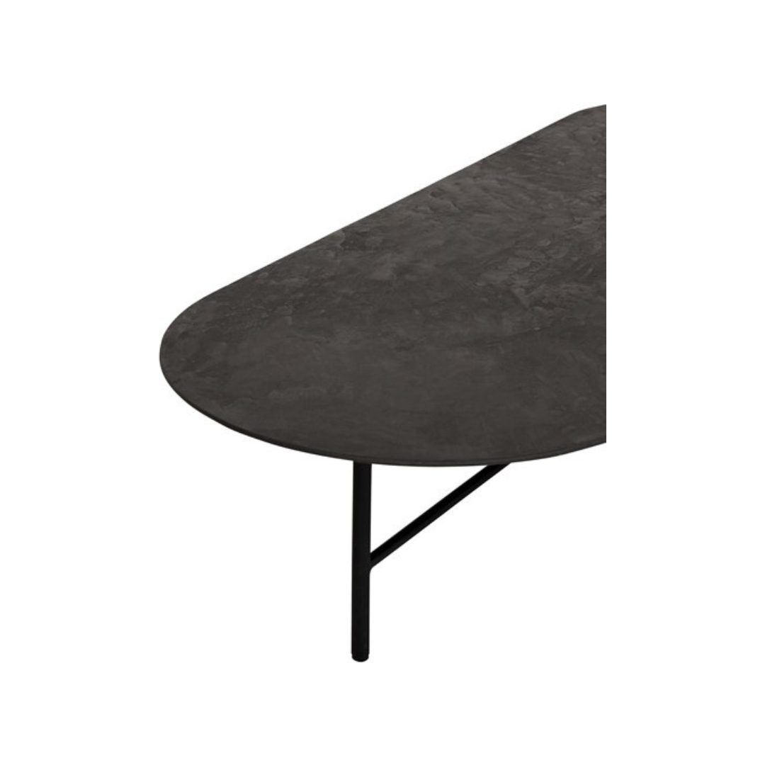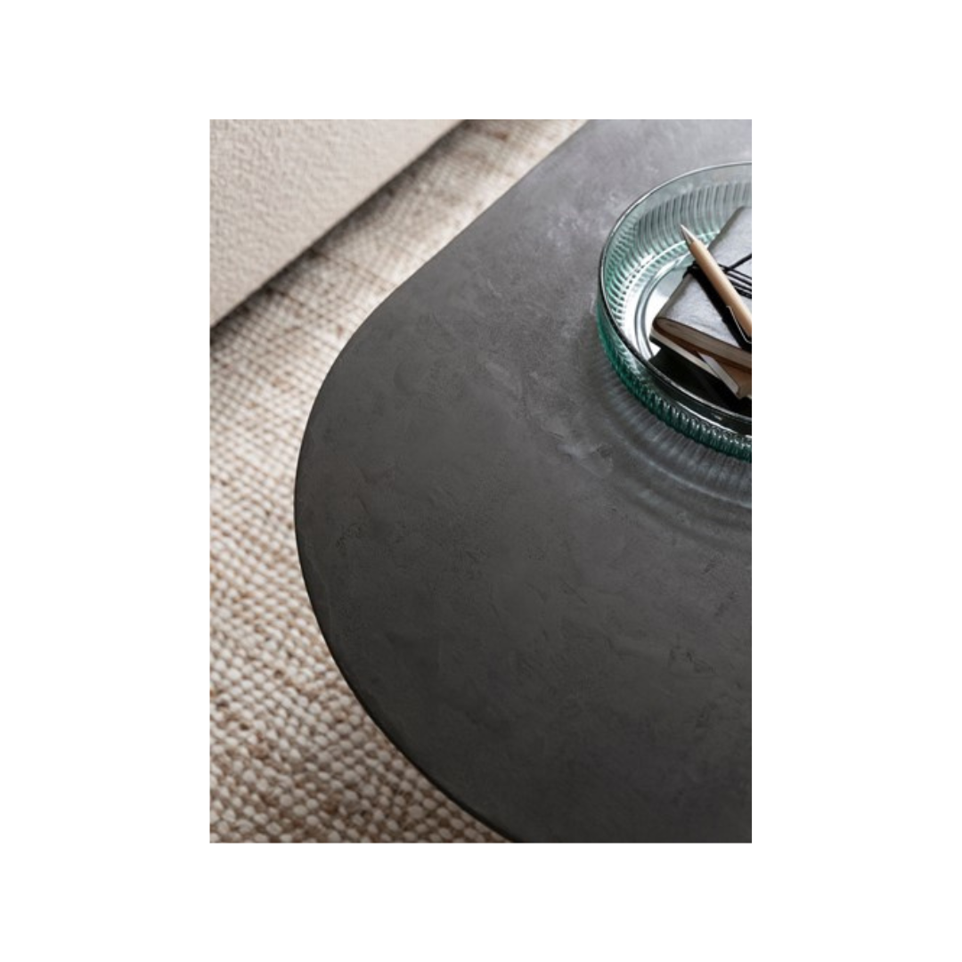 Tyylikäs musta sohvapöytä mustilla metallijaloilla. Upea liuskekiven ja sementin yhdistelmä on uniikki viimeistelty pöytälevy, sen viistoleikkaukset ja kädelle pehmeä tuntu tuovat kotoisuutta ja lämpöä olohuoneen sisustukseen. Näyttävä ja iso olohuoneen pöytä pyöristetyillä kulmilla on elegantti valinta.