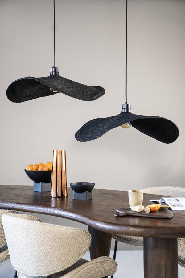 Elegantti lierimäinen kattovalaisin, jonka narupunokseen on kudottu mukaan ohuen ohuita metallisäikeitä, jotka sekä vahvistavat valaisinta että tekevät pienen  hohteen valaisimeen. kun valo osuu siihen. Näyttävä kaunis kattovalaisin, joka valaisee hyvin myös suoraan alapuolelle, josta syystä se soveltuu hyvin esimerkiksi keittiön valaisimeksi.