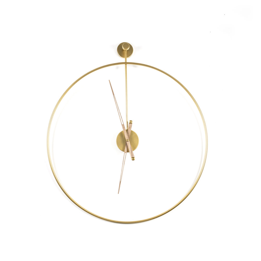 Sundial small seinäkello on saanut inspiraationsa aurinkokellon yksikertaisesta ideasta. Moneen tilaan sopivan 50cm halkaisijan kullanvärinen metallikierre ja linjakkaat puuviisarit yhdistyvät näyttäväksi seinäkelloksi, joka sekä näyttää ajan että koristaa seinän tyylillä. Ripustus seinälle heilurimaisesta pidikkeestä. Saatavilla myös suurempi koko.