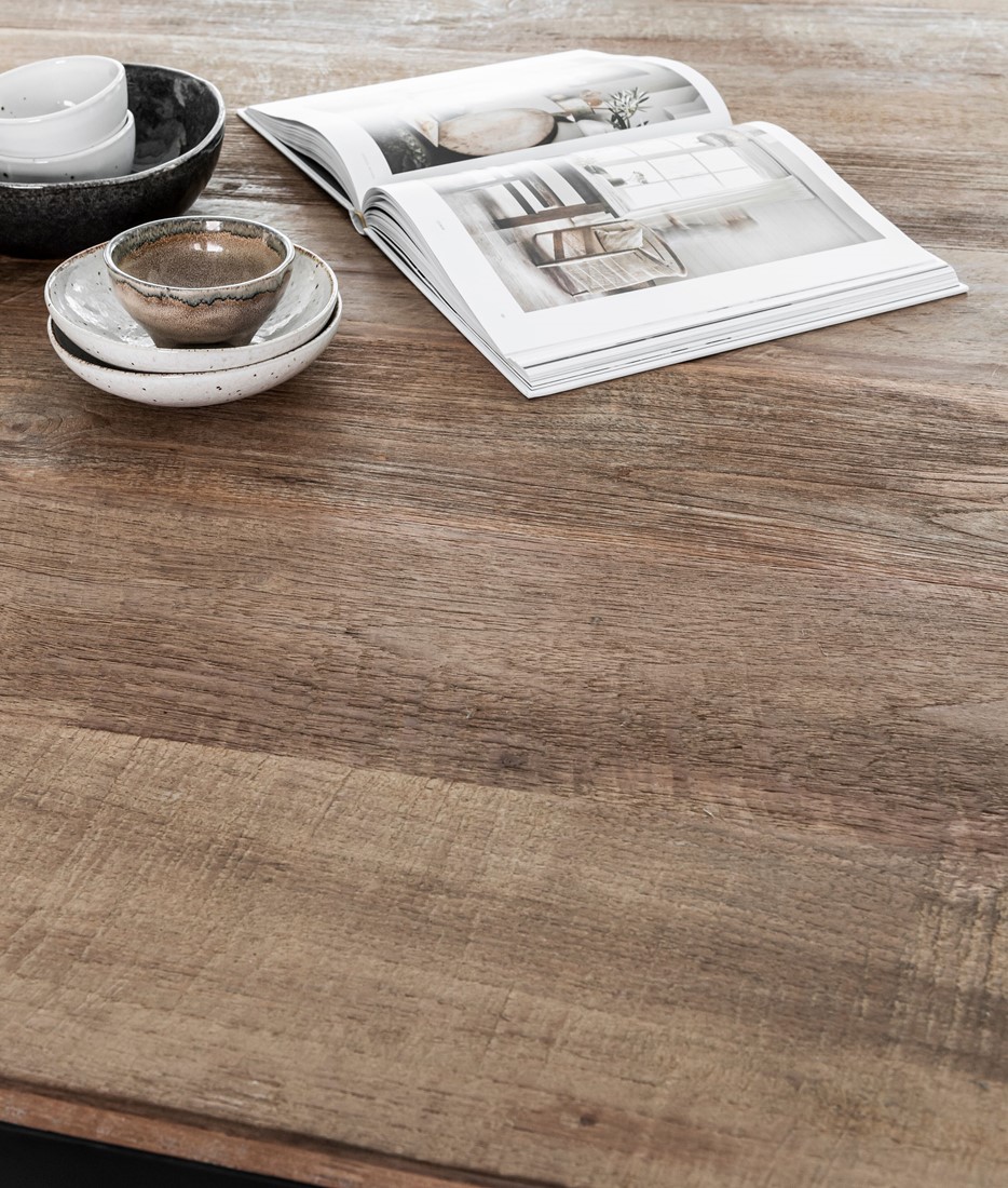 SNUGGin saarekepöydät tehdään eettisesti kerätystä sertifioidusta kierrätystiikistä ja raudasta. Puinen pöytä on helppohoitoinen, sillä tiikki materiaalina on erittäin vahvaa eikä parkkiintunut luonteeltaan öljyinen puu ime itseensä likaa. Siten useimmiten pyyhkäisy riittää. Suosittelemme, että tiikkipuuta ei käsiteltäisi tai käsiteltäisiin mahdollisimman vähän. Vesi- ja rasvatahrat voidaan poistaa vedellä ja puhdistussienellä. Pysyvät tahrat voidaan poistaa vedellä ja miedolla astianpesuaineella. Hellävarainen puhdistus on tärkeää, sillä kova hankaus voi muuttaa pöydän väriä. Puu voidaan suojata luonnonmukaisella puuvahalla. Puuvaha muuttaa kuitenkin tiikkipöydän ulkonäköä, joten emme suosittele sitä.