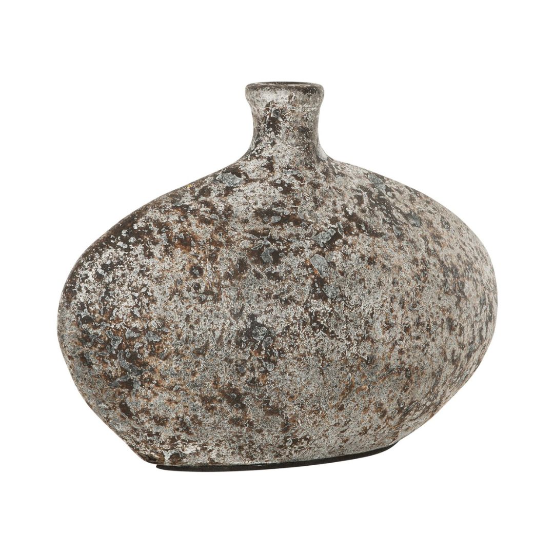Leveä rustiikki kukkamaljakko, jonka upea patinoitu kivimäinen pintakäsittely tekee jokaisesta maljakosta uniikin. Sopii yhdelle kukalle ja asetelmiin tai somistukseen. Tätä kaunista terrakotta maljakkoa on kiva ihailla ihan sellaisenaan tai voit sisustaa sillä helposti yhdellä oksalla, heinällä tai kukalla.
