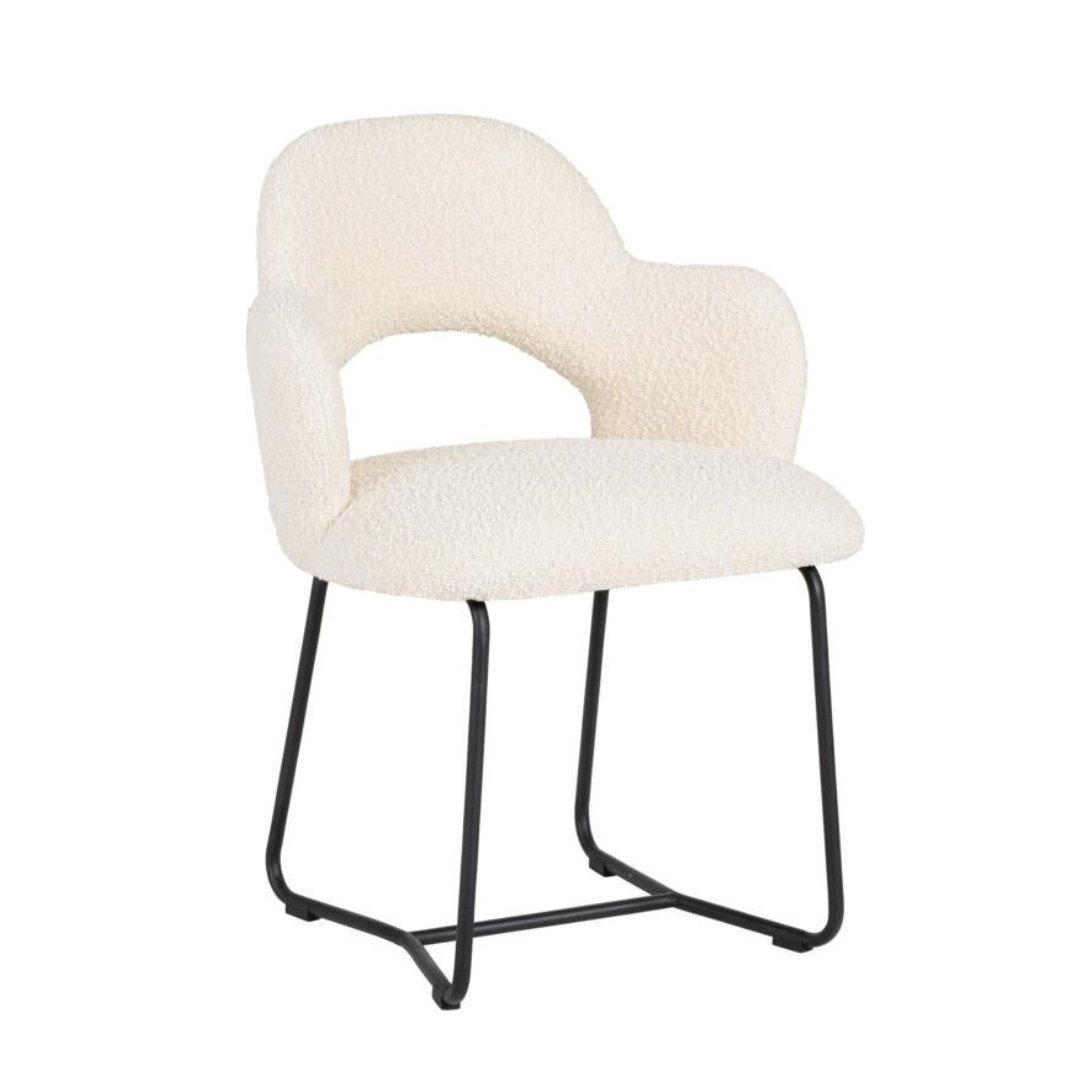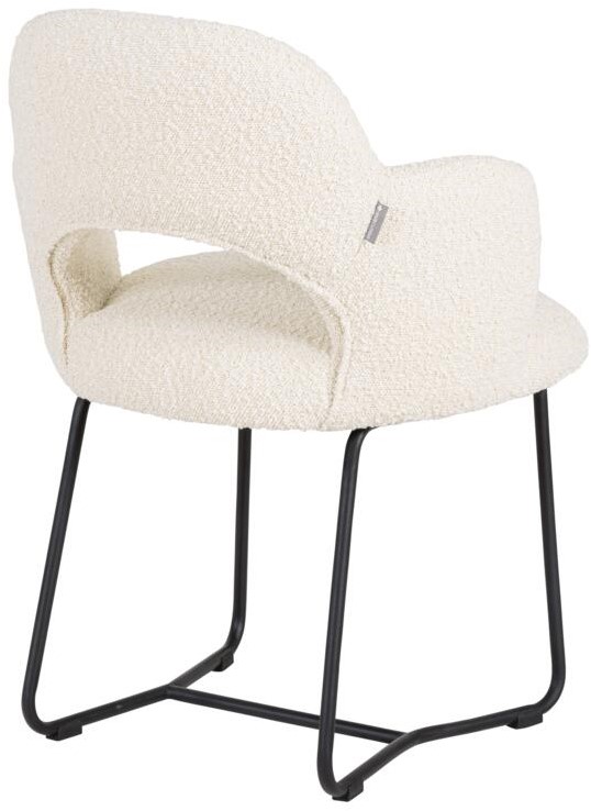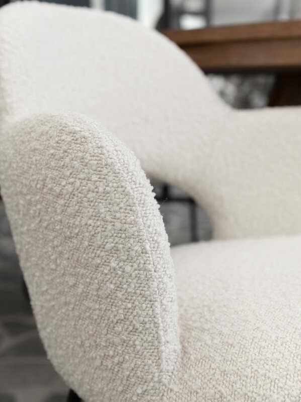 Käsinojallinen Vista ruokapöydän tuoli kutsuu istumaan pidempääkin iltaa. Tuolissa on metallinen tukeva runko ja jalat sekä miellyttäväksi pehmustettu boucle -kankainen istuinosa. Pienet käsinojat tuovat extramukavuutta. Valkoinen tuoli on ylellinen valinta. Istuimen jämäkkä mutta pehmeä selkänoja on muotoiltu hieman kuppimaiseksi, mikä tekee tuolista istuinmukavuudeltaan huippuhyvän.