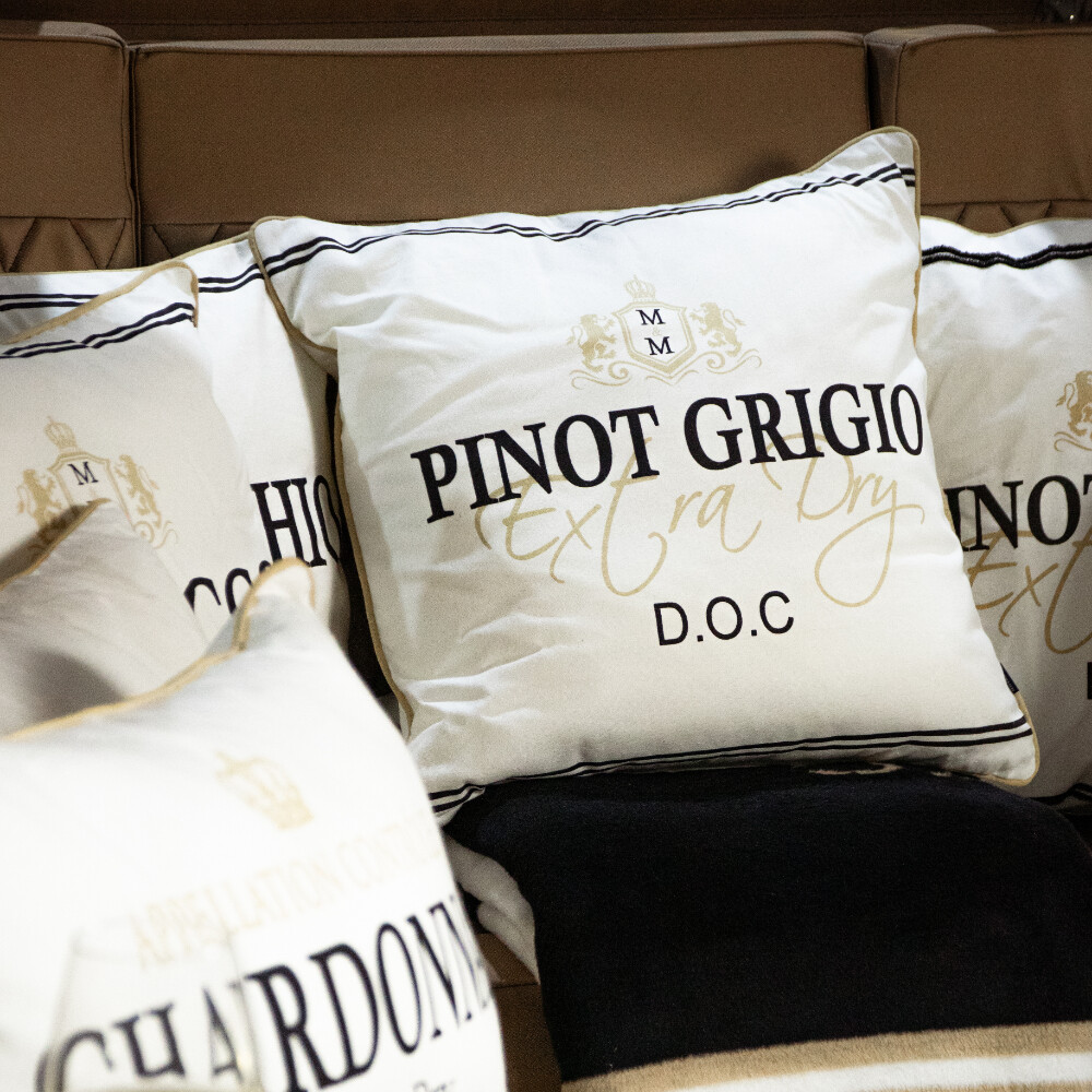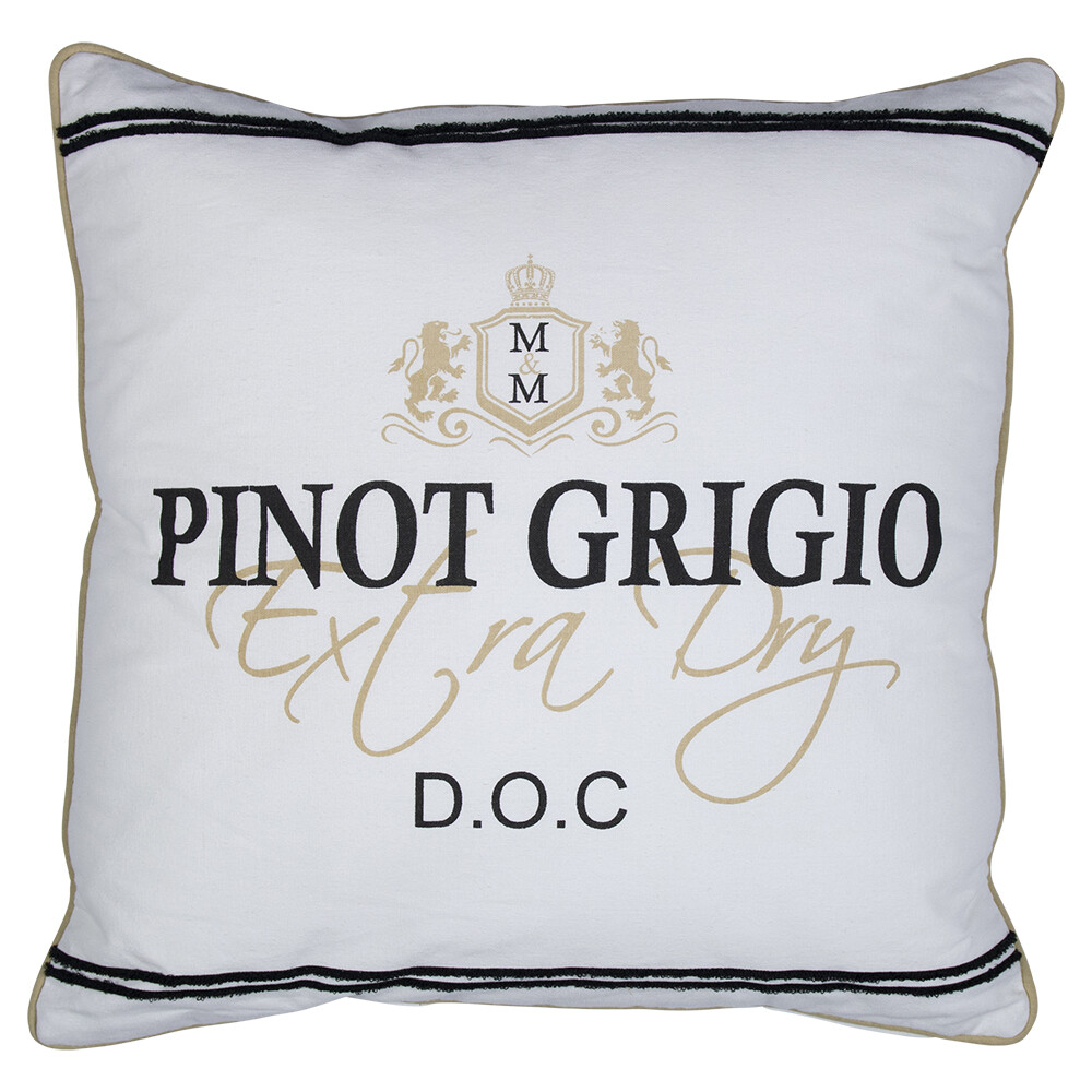Viinin ystävän sisustustyyny. Iso valkoinen sisustustyyny pinot gricio -tekstillä kelpaa nojailuun viinin siemailun lomassa. Valkoinen tyylikäs sohvatyyny sopii moneen sisustukseen, ja piristät sillä yksiväristen sohvatyynyjen joukkoa. Sopii niin tummaan kuin vaaleaankin sisustukseen. Irrotettava sisätyyny sisältyy. Pesu 30 ’C.