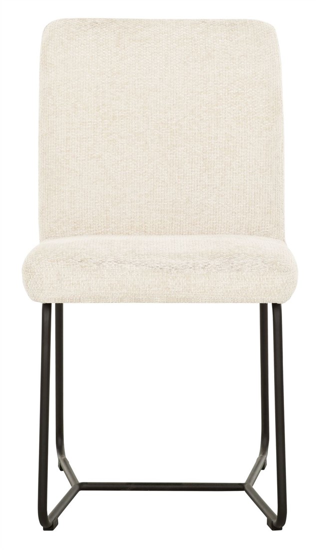 Valkoinen ruokapöydän tuoli vetoaa tyylikkäällä kangaspinnalla ja napakalla istuimella. Luonnonvalkoinen kangasverhoilu on näyttävä ja suunniteltu tuomaan ylellistä tunnelmaa ruokailutilaan. Tuolin rungon muotoilu on mielenkiintoinen. Musta metallinen musta runko taipuu selkänojan takana kahvaksi, joka on sekä tyylikäs yksityiskohta että helpottaa tuolin siirtelyä ja mahdollistaa myös kahvan käyttämisen lautasliinan tai muiden koristeiden ripustamiseen.